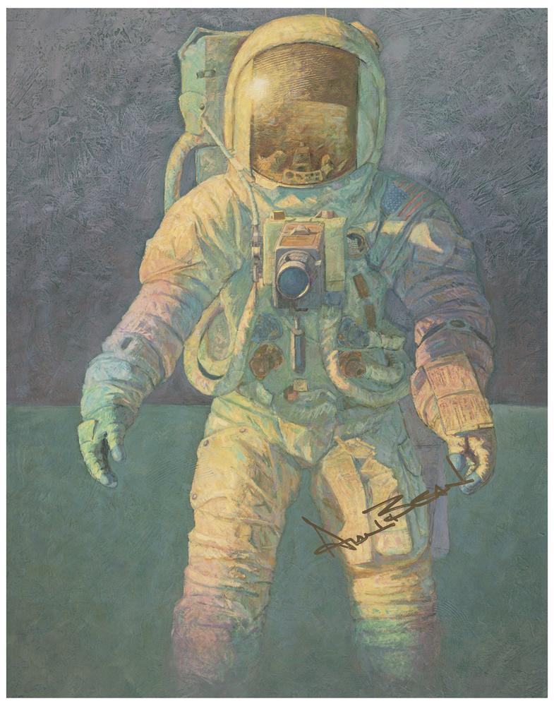 Uncommon color semi-glossy 11 x 14 dual-sided promotional card with the front depicting Alan Bean's painting ‘That’s How It Felt to Walk on the Moon,' signed on the front in gold ink. Reverse features information text relative to the artwork and artist. In fine condition, with trivial paper loss to lower right of reverse.