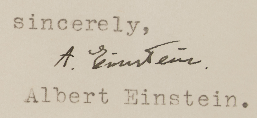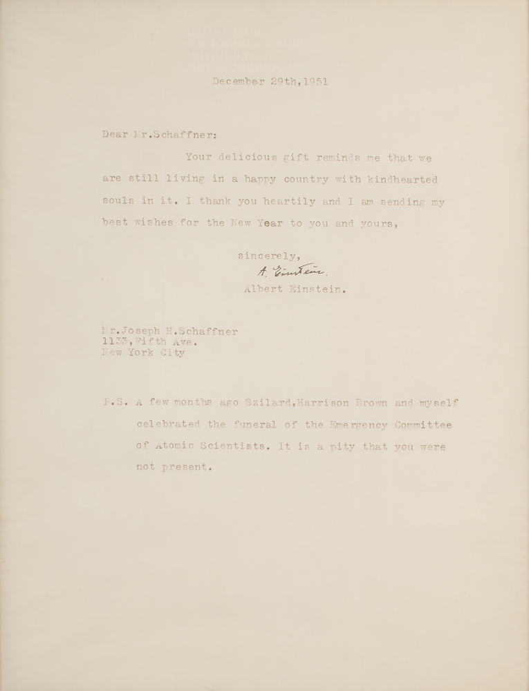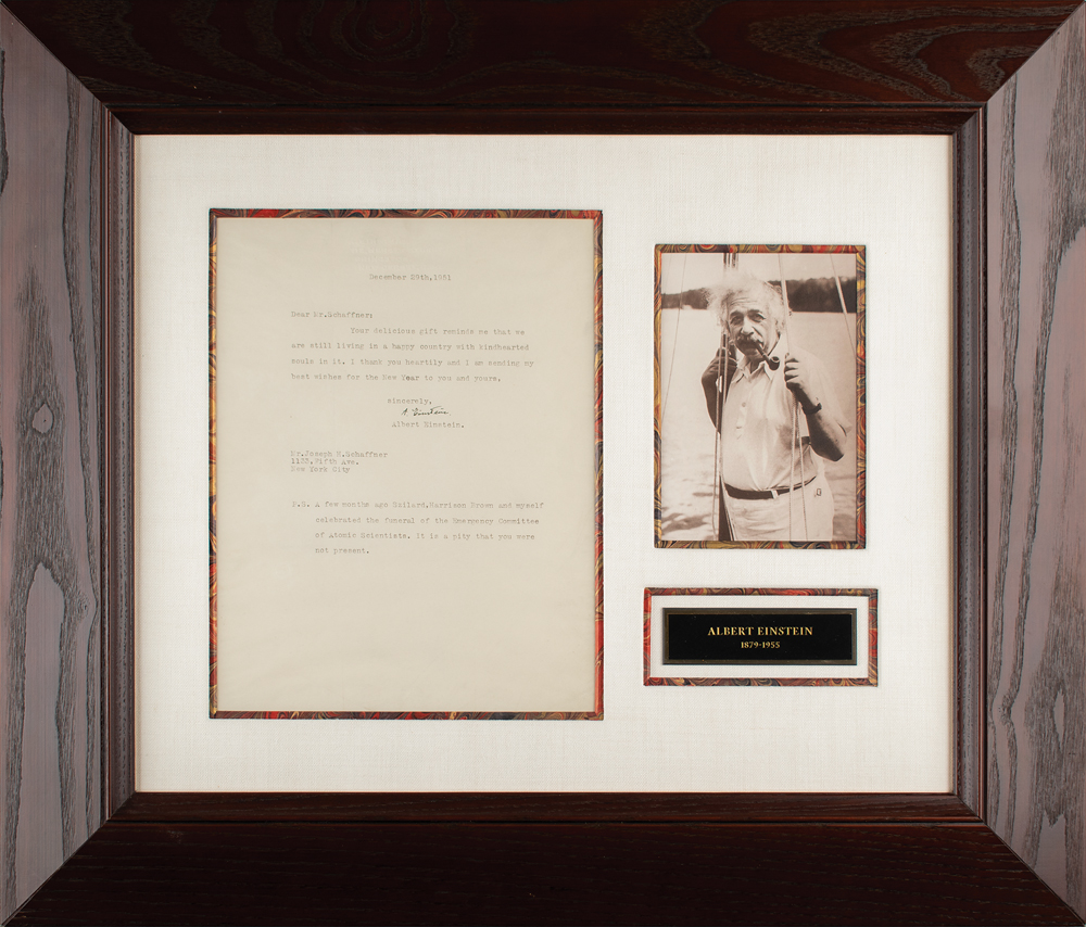 TLS signed “A. Einstein,” one page, 8.25 x 10.5, blindstamped personal Princeton letterhead, December 29, 1951. Letter to noted collector Joseph H. Schaffner in New York City, in full: "Your delicious gift reminds me that we are still living in a happy country with kindhearted souls in it. I thank you heartily and I am sending my best wishes for the New Year to you and yours?P.S. A few months ago Szilard, Harrison Brown and myself celebrated the funeral of the Emergency Committee of Atomic Scientists. It is a pity that you were not present." Beautifully double-matted and framed with a plaque and photograph to an overall size of 23.75 x 20.25. In fine condition, with light overall wrinkling.