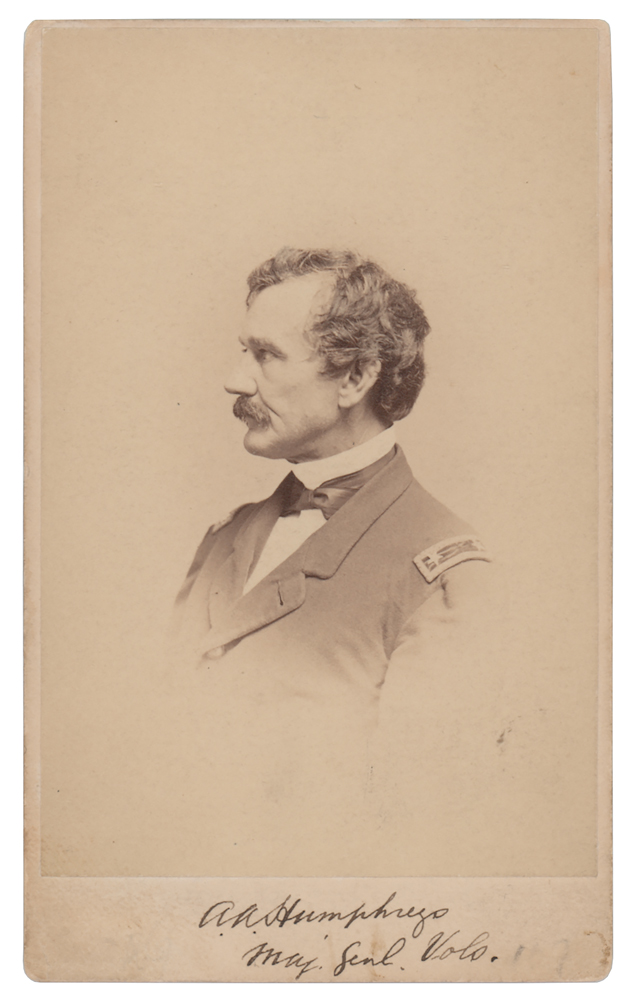 Career US Army officer, civil engineer, and Union General (1810-1873) remembered for his gallantry at Gettysburg. Uncommon 2.5 x 4 carte-de-visite photo of Humphreys in his Union Army uniform, signed on the mount in crisp ink, "A. A. Humphreys, Maj. Genl. Vols." Published by F. Gutekunst of Philadelphia. In fine condition.