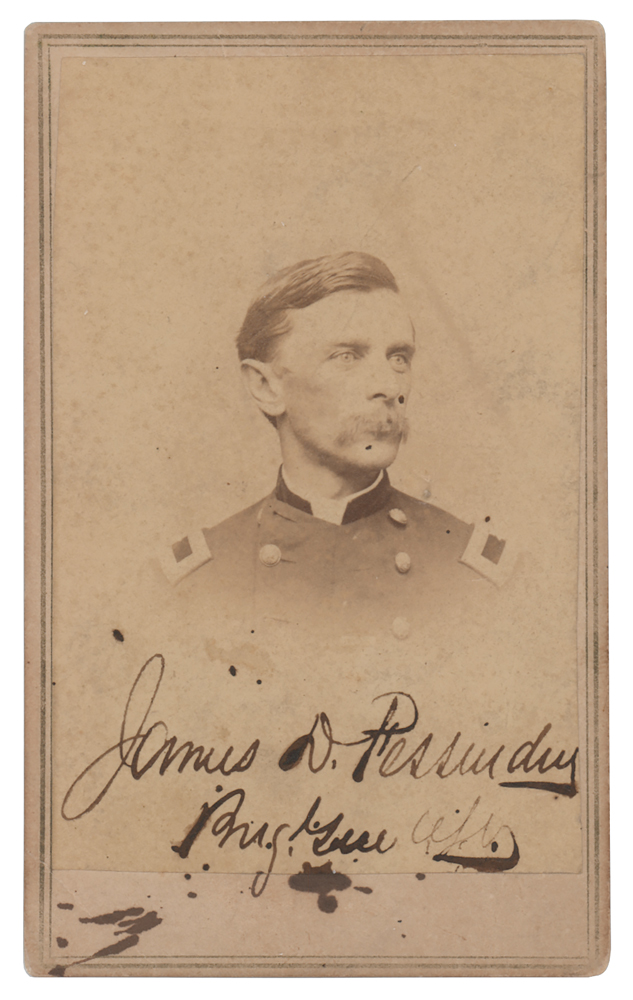 Maine lawyer, politician, and soldier (1833-1882) who served as a general in the Union Army and organized one of the first black regiments. Scarce 2.25 x 4 carte-de-visite photo of Fessenden in uniform, signed in ink, "James D. Fessenden, Brig. Gen. U.S.V." In fine condition, with light soiling, scattered stray ink marks, and some old adhesive residue on the reverse.