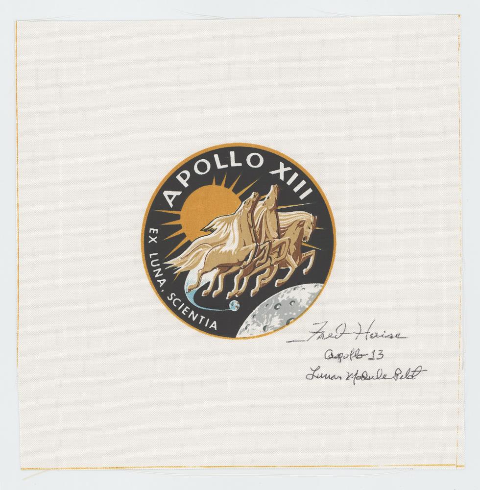 An 8 x 8 swatch of Beta cloth bearing a central design of the Apollo 13 mission insignia, signed in black ballpoint, "Fred Haise, Apollo 13, Lunar Module Pilot." In fine condition.
