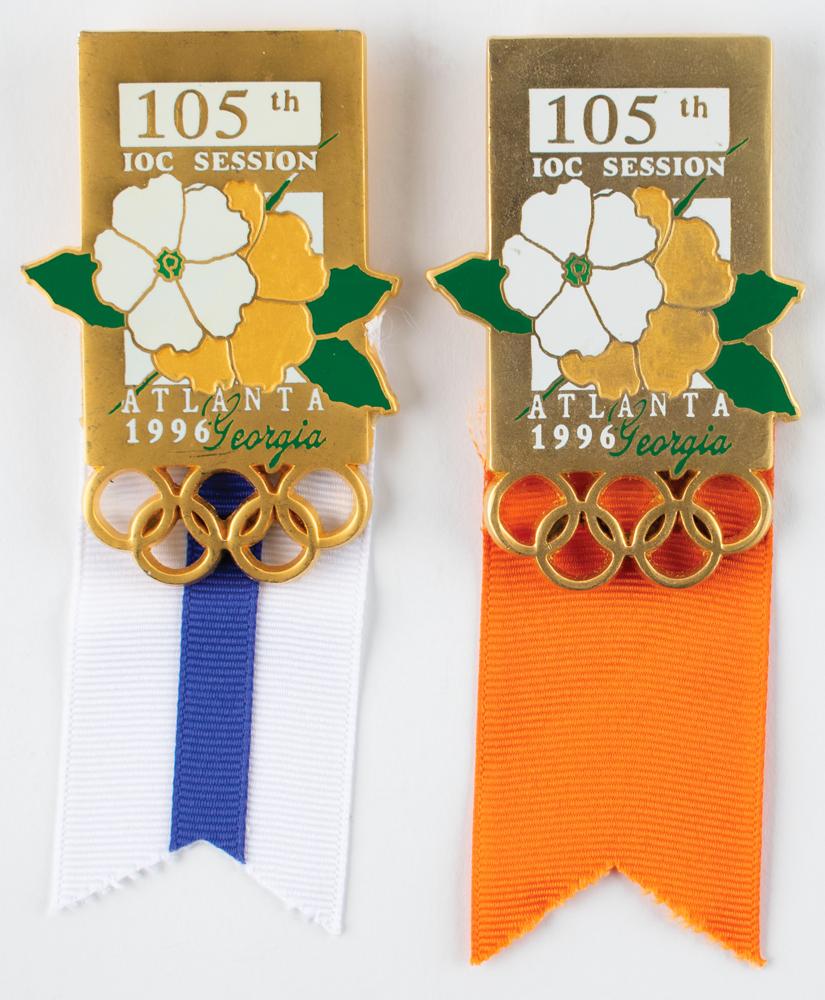 Two gold-tone badges from the 105th International Olympic Committee session held in Atlanta in 1996, on the occasion of the Games of the XXVI Olympiad. Both measure 50 mm x 115 mm, and feature the text, "105th IOC Session, Atlanta, Georgia, 1996," with flowers and the Olympic rings; one bears a blue-and-white ribbon, and the other a solid orange ribbon.