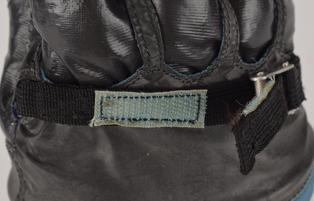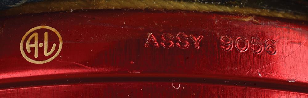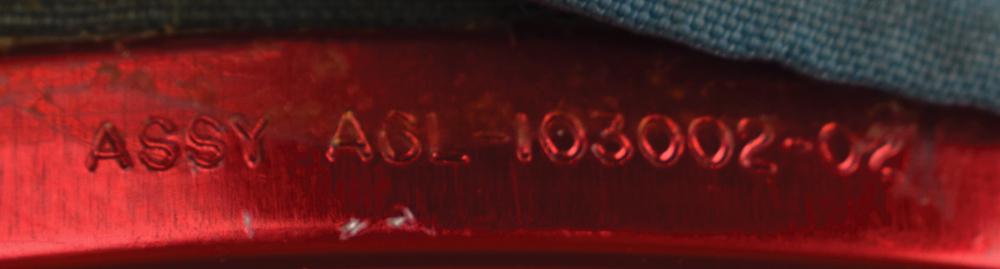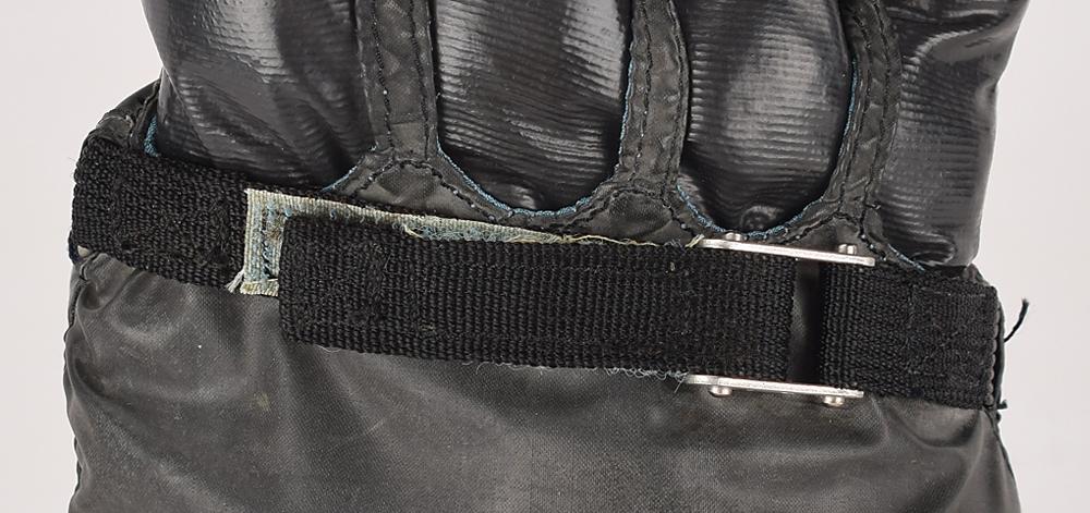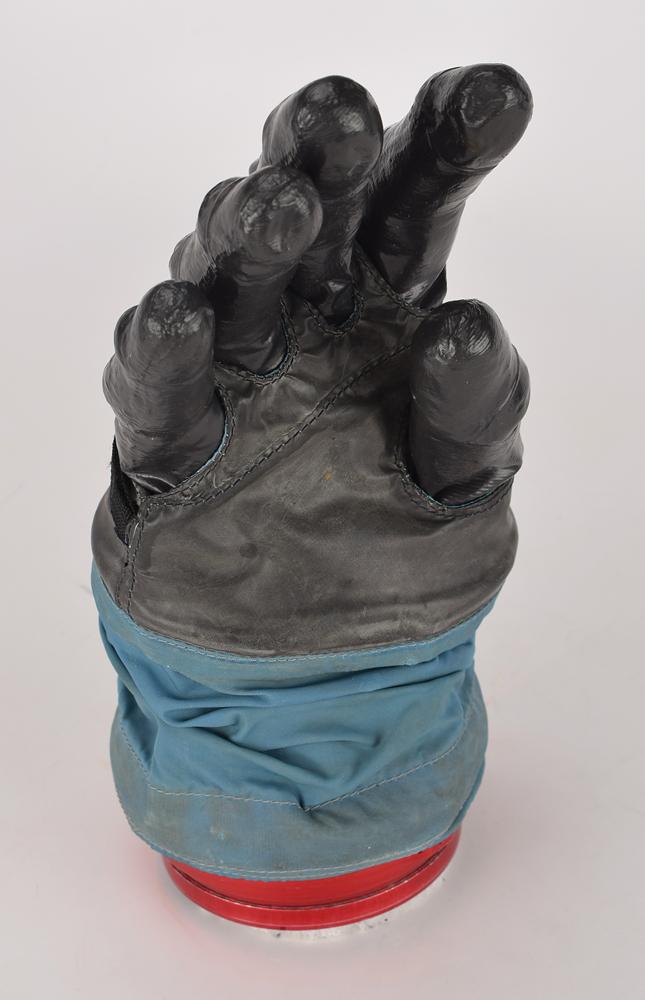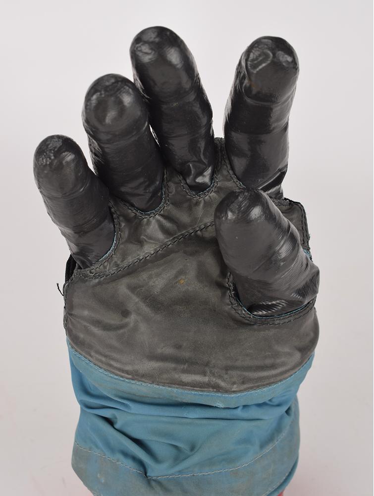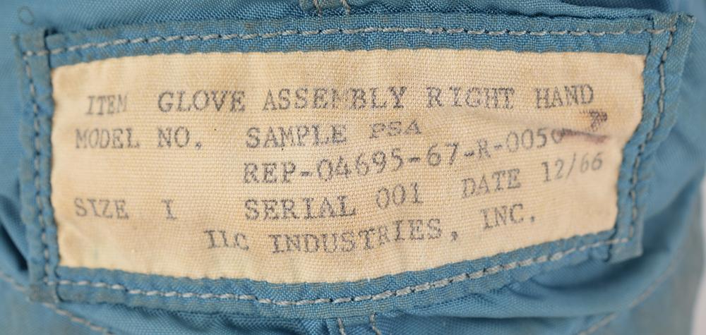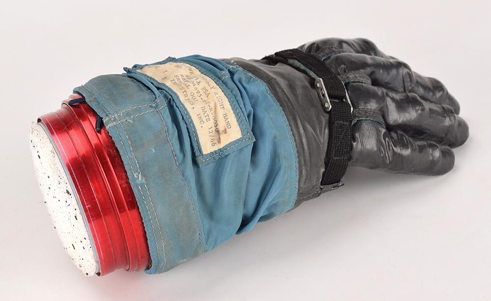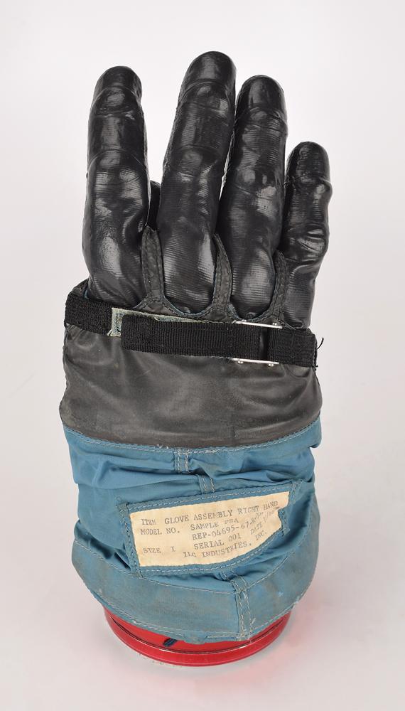 Very early right-handed A6L intravehicular glove assembly made by ILC Industries, Inc., with a wrist opening diameter of 3.25″ and standing approximately 9.5″ in height. The glove is constructed of a rubber/neoprene-compound bladder, dip molded with the backside of hand near the wrist section featuring a sewn-on manufacturer’s label: “Item Glove Assembly Right Hand, Model No. Sample PSA, REP-04695-67-R-0050, Size I, Serial 001, Date 12/66, ILC Industries, Inc.” A fingerless glove restraint designed to maintain the glove's shape is attached to the bladder at the wrist and encloses the entire hand excluding the fingers and thumb, and the interior features a convoluted wrist section for ease of movement and a red anodized aluminum connector for attachment to the space suit, with the connector marked: “Assy 9056, SN-222, Assy A6L-103002-02.” In fine condition, with expected signs of use. From the collection of a member of the engineering and design team at ILC Industries in Dover, Delaware, from 1964 to 1972.