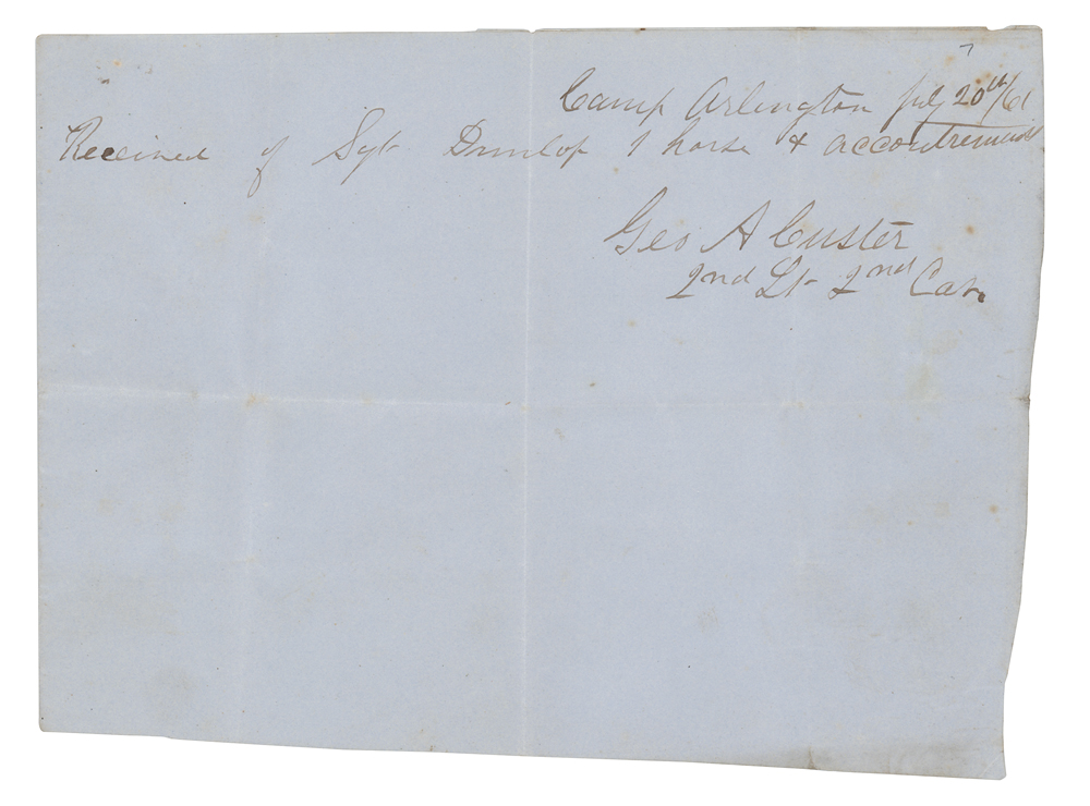 Civil War-dated ADS, signed “Geo. A. Custer, 2nd Lt. 2nd Cav.,” one page, 6.75 x 5, July 20, 1861. One day before the First Battle of Bull Run, Custer prepares a horse at Camp Arlington, in full: "Received of Sgt. Dunlop 1 horse & accouterments." In very good to fine condition, with trimmed edges, intersecting folds, and overall creasing. Accompanied by a full letter of authenticity from JSA.