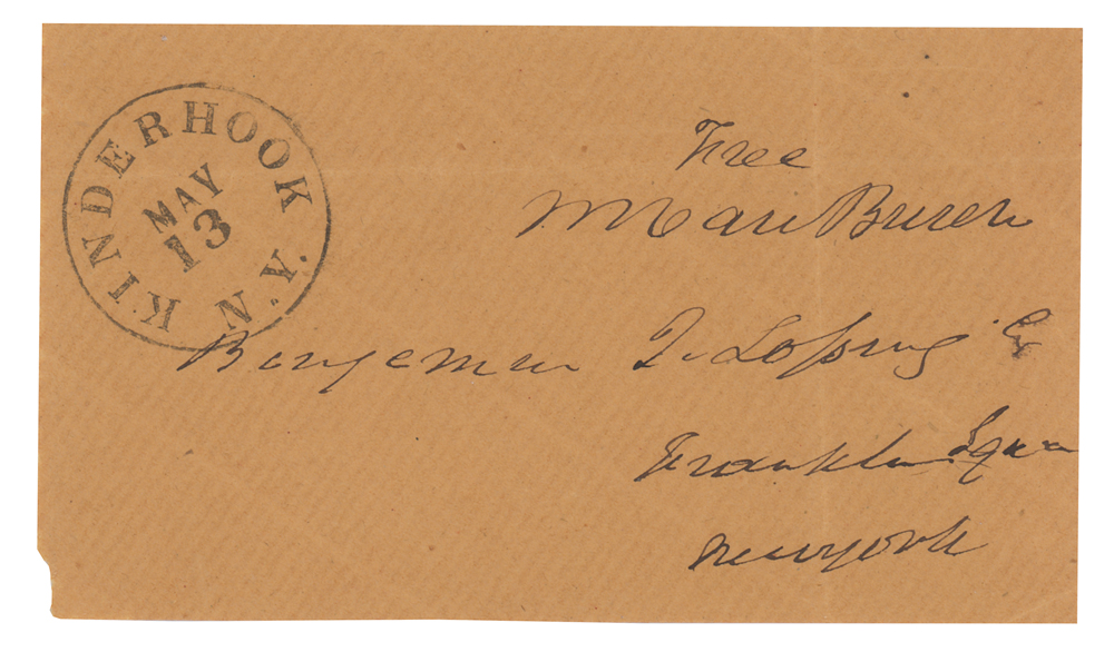 Hand-addressed and free franked mailing panel, 4.75 x 2.75, addressed by Van Buren to "Benjamin T. Lossing, Esq., Franklin Square, New York," and franked in the upper right, "Free, M. Van Buren." Postmarked at Kinderhook, NY, May 13, [no year]. In fine condition.