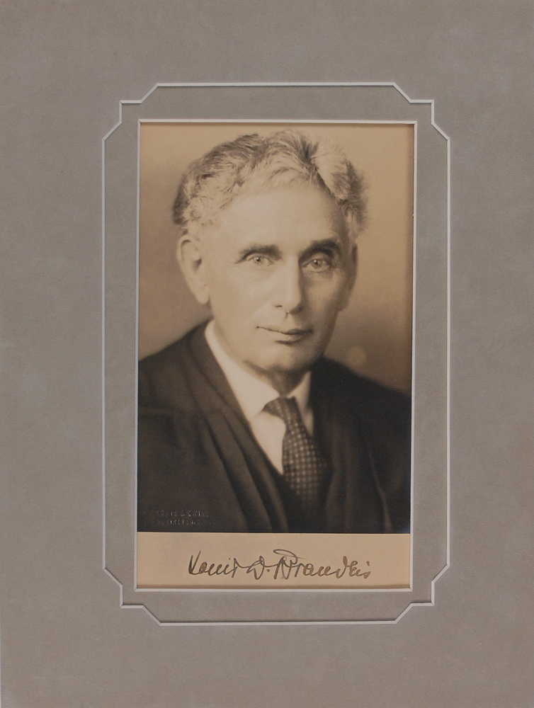 Associate justice of the US Supreme Court (1856-1941) from 1916 to 1939, remembered as the first Jewish person to serve on the Court. Vintage matte-finish 4 x 7 Harris & Ewing portrait of Justice Brandeis in his judicial robe, signed in the lower border in fountain pen, "Louis D. Brandeis." Blindstamped in the lower left by the studio. Double-matted to an overall size of 8 x 10.5. In fine condition.