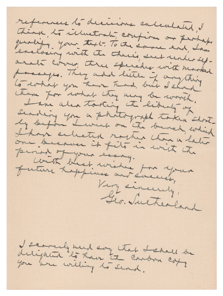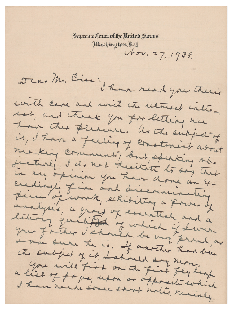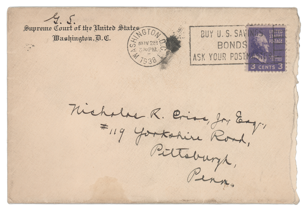 Conservative jurist and politician (1862-1942) who served as an associate justice on the Supreme Court from 1922 to 1938. ALS signed “Geo. Sutherland,” two pages on two adjoining sheets, 5.75 x 7.75, Supreme Court of the United States letterhead, November 27, 1938. Letter to Nicholas R. Criss, in part: "I have read your thesis with care and with the utmost interest?As the subject of it, I have a feeling of constraint about making comments; but, speaking objectively, I do not hesitate to say that in my opinion you have done an exceedingly fine and discriminating piece of work, exhibiting a power of analysis, a grasp of essentials, and a literary quality of which if I were your father I should be very proud, as I am sure he is. If another had been the subject of it, I should say more. You will find on the first fly leaf a list of pages, upon or opposite which I have made some short notes, mainly references to decisions calculated, I think, to illustrate, confirm or perhaps qualify your text." In fine condition. Accompanied by the original mailing envelope addressed in Sutherland's hand, with his initials ("G. S.") above the printed return address.