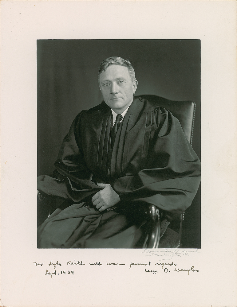 Striking matte-finish 10 x 13.25 portrait of Justice Douglas by Underwood & Underwood, boldly signed and inscribed in the lower border in fountain pen, "For Lyle Keith, with warm personal regards, Wm. O. Douglas, Sept. 1939." Also signed in pencil by the photography studio. In fine condition, with some light adhesive residue in the right border and a small ding in the left border.