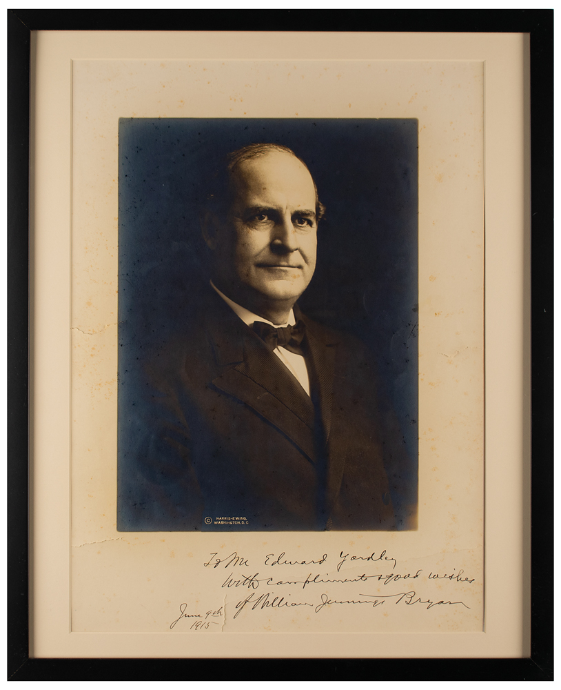Huge vintage matte-finish 13 x 18 Harris & Ewing photo of the Populist politician, signed and inscribed in the lower border in ink, "To Mr. Edward Yardley, With compliments & good wishes of William Jennings Bryan, June 9th, 1915.” Matted and framed to an overall size of 17.25 x 21.25. In very good condition, with silvering to the image, and foxing, creasing, and noticeable tears to the borders.