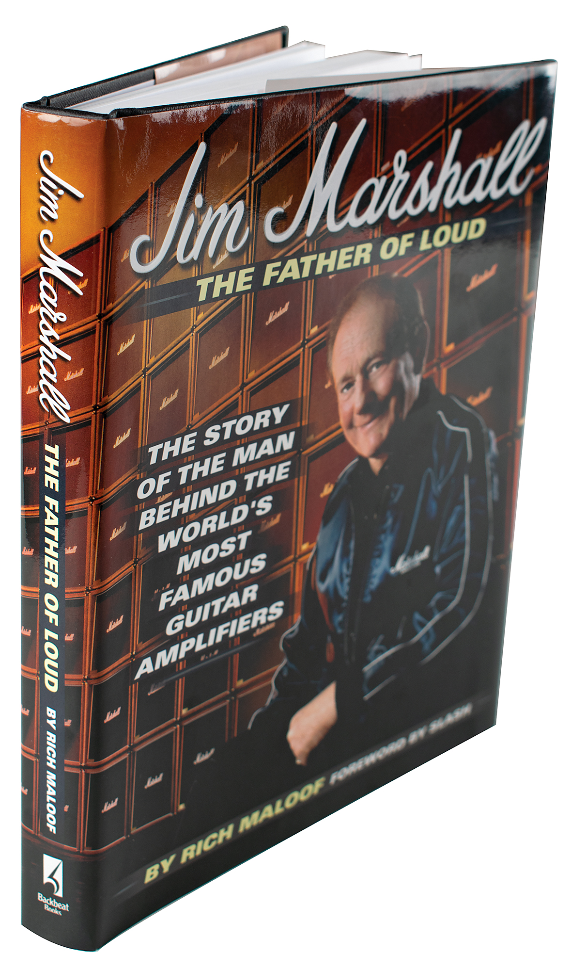 Signed book: Jim Marshall: The Father of Loud. First edition. San Francisco, CA: Backbeat Books, 2004. Hardcover with dust jacket, 7.5 x 9.25, 256 pages. Signed on the first free end page in black felt tip, "Dr. Jim Marshall OBE." The page is also signed by four guitarists from chart-topping rock and metal bands—Jerry Cantrell of Alice in Chains, John 5 of Marilyn Manson and Rob Zombie, Kerry King of Slayer, and Slash of Guns N' Roses, who adds the inscription "To Marc." In fine condition.