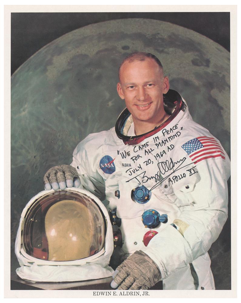 Fantastic official color 8 x 10 NASA lithograph of Aldrin posing in his white space suit against a lunar background, signed in black felt tip, "'We Came in Peace for All Mankind,' July 20, 1969 AS, Buzz Aldrin, Apollo XI." In very fine condition.