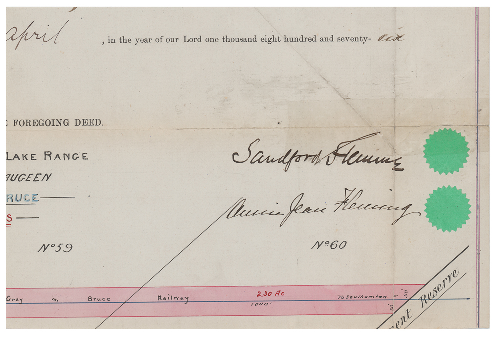 Engineer and inventor (1827-1915) who promoted worldwide standard time zones, designed Canada's first postage stamp, and engineered much of the Intercolonial Railway and Canadian Pacific Railway. Bold ink signature, "Sandford Fleming,” on an off-white 8.5 x 5.75 slip clipped from a deed dated April 1876, countersigned by his wife, "Annie Jean Fleming." In very good to fine condition, with a piece of clear tape passing over the top of the signature.