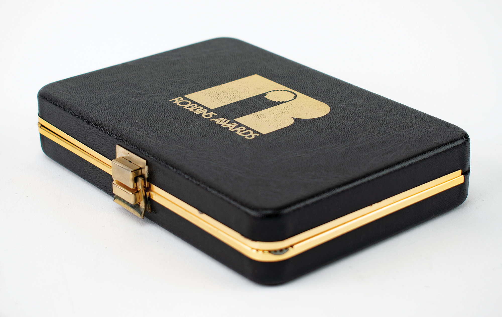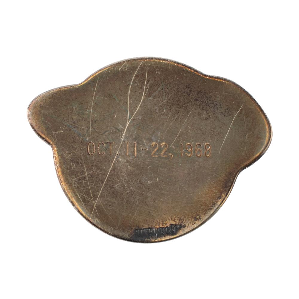Unflown sterling silver Apollo 7 Robbins medal, possibly a prototype or salesman's sample, approximately 1″ in diameter, featuring a raised design of the mission insignia on the face. The reverse is engraved with the mission's dates, “Oct. 11-22, 1968," and stamped with the Robbins hallmark. Condition is mint state, with mild tarnishing to reverse. Accompanied by a small plastic box and larger hinged "Robbins Awards" case, measuring 6″ x 4″ x 1″. From the collection of a former Robbins Company executive.