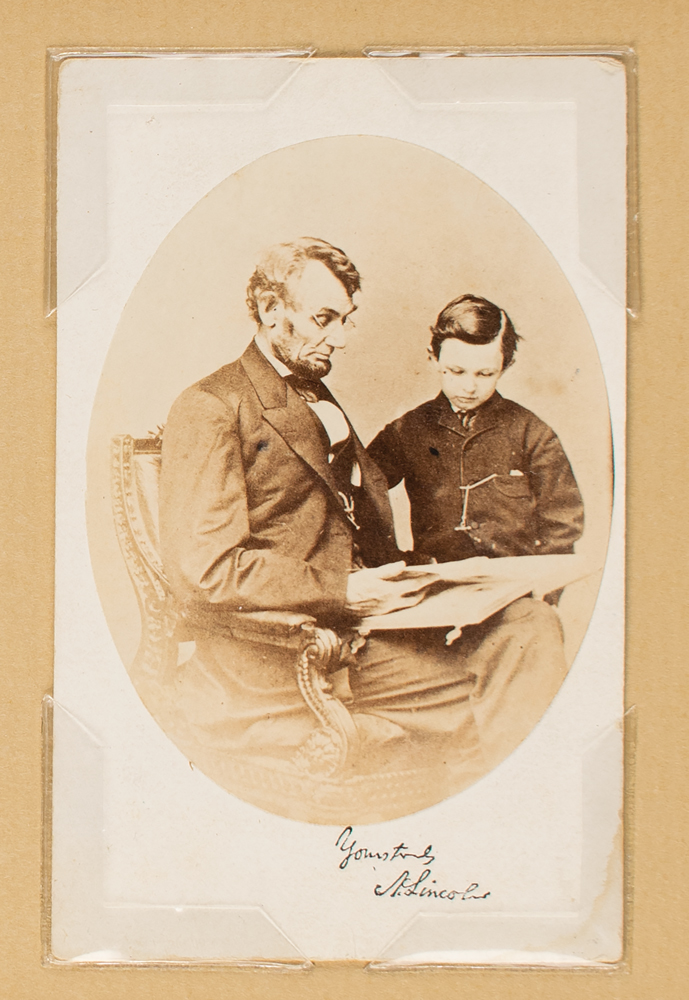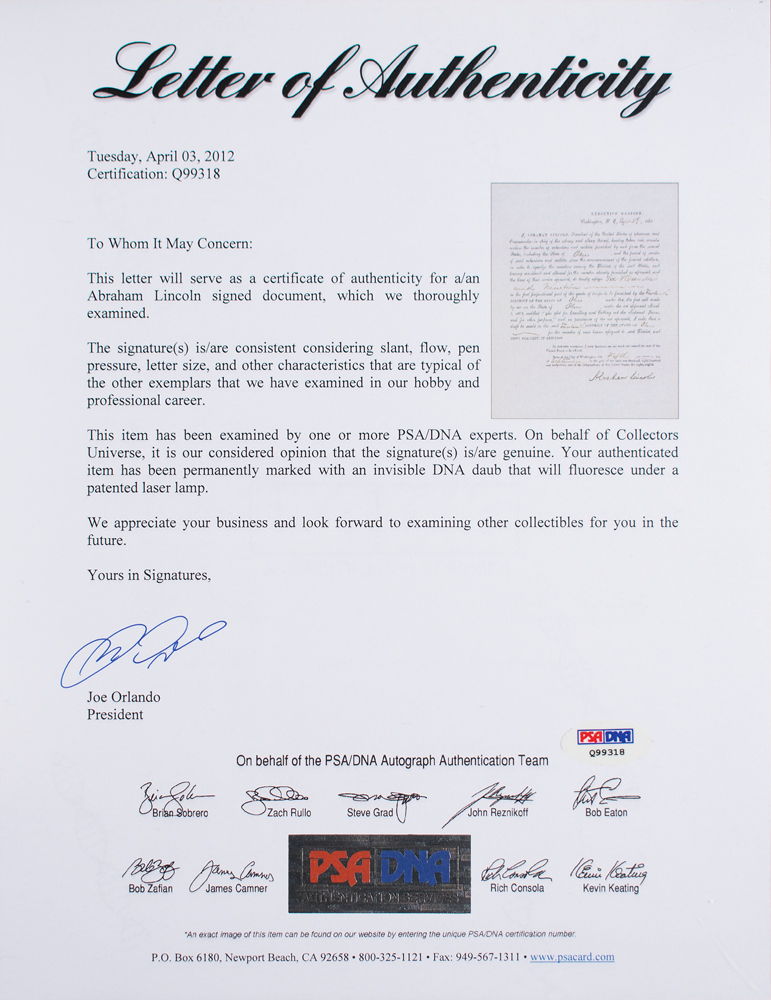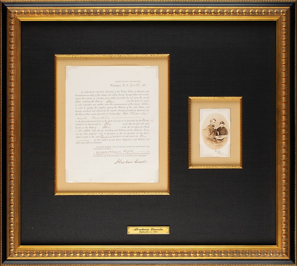 Civil War-dated partly-printed war-dated DS as president, one page, 7.75 x 9.75, September 5, 1863. Draft order for the Union Army issued by President Lincoln from the Executive Mansion, sent to the War Department. In full: "I, Abraham Lincoln, President of the United States of America, and Commander-in-chief of the Army and Navy thereof, having taken into consideration the number of volunteers and militia furnished by and from the several States, including the State of Ohio, and the period of service of said volunteers and militia since the commencement of the present rebellion, in order to equalize the numbers among the Districts of said States, and having considered and allowed for the number already furnished as aforesaid, and the time of their service aforesaid, do hereby assign Six Hundred and Nineteen as the first proportional part of the quota of troops to be furnished by the Fourteenth District of the State of Ohio under this, the first call made by me on the State of Ohio, under the act approved March 3, 1863, entitled 'An Act for Enrolling and calling out the National Forces, and for other purposes,' and in pursuance of the act aforesaid, I order that a draft be made in the said Fourteenth District of the State of Ohio, for the number of men herein assigned to said District, and fifty percent in addition." Corner-mounted, matted, and framed with an original CDV portrait of Lincoln reading with his son (bearing a facsimile signature) under UV-protective museum glass to an overall size of 25 x 22. A few tiny stains, otherwise a choice example in fine, clean condition. Accompanied by a full letter of authenticity from PSA/DNA.