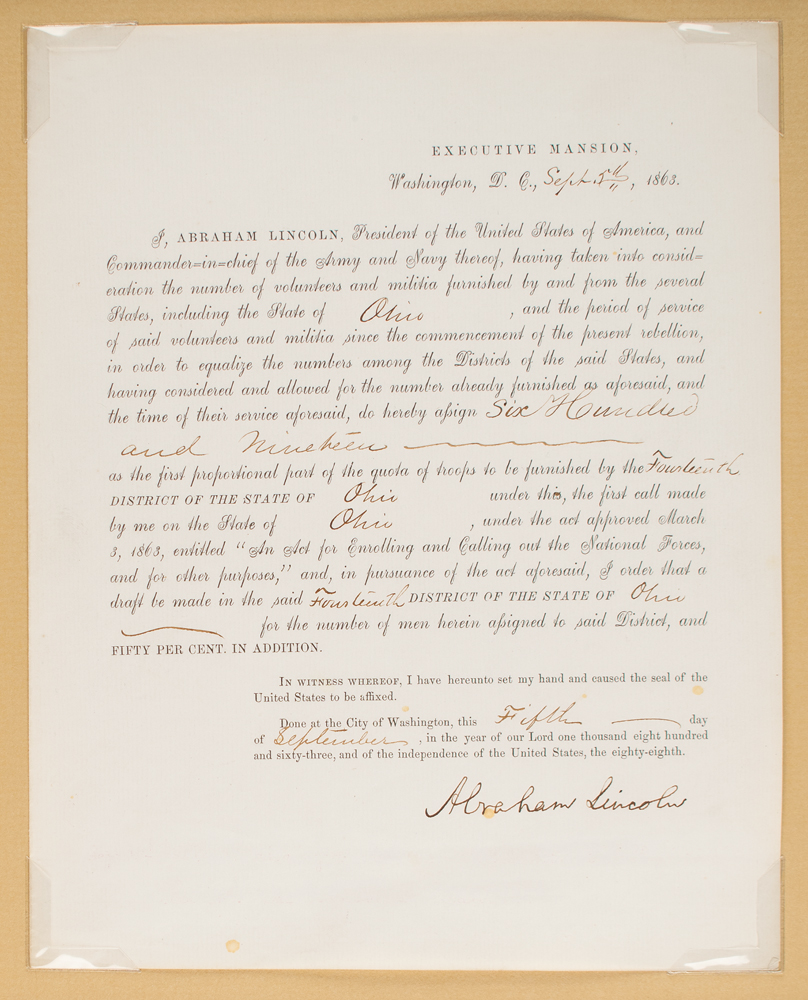 In 1863, Lincoln established a military draft to replenish the Union Army's depleted ranks, and signed this draft requisition targeting men in the Buckeye State-specifically, a request for at 619 troops from Ohio's 14th district as part of "the first call made by me on the State of Ohio." The concept of conscription was controversial in the war-torn Union, with the Conscription Act requiring states to draft men to serve in the armed forces if individual states did not meet their enlistment quotas through volunteers. The federal government oversaw the draft and created provost marshals to enforce it; all white men between the ages of 20 and 45 were eligible. The Conscription Act permitted drafted men to pay a $300 fee or hire a substitute to escape service if they were drafted. More than 310,000 Ohioans would serve in the Northern army for varying lengths of time, exceeding the government's quota by 4,332 soldiers. A controversial but necessary wartime order.