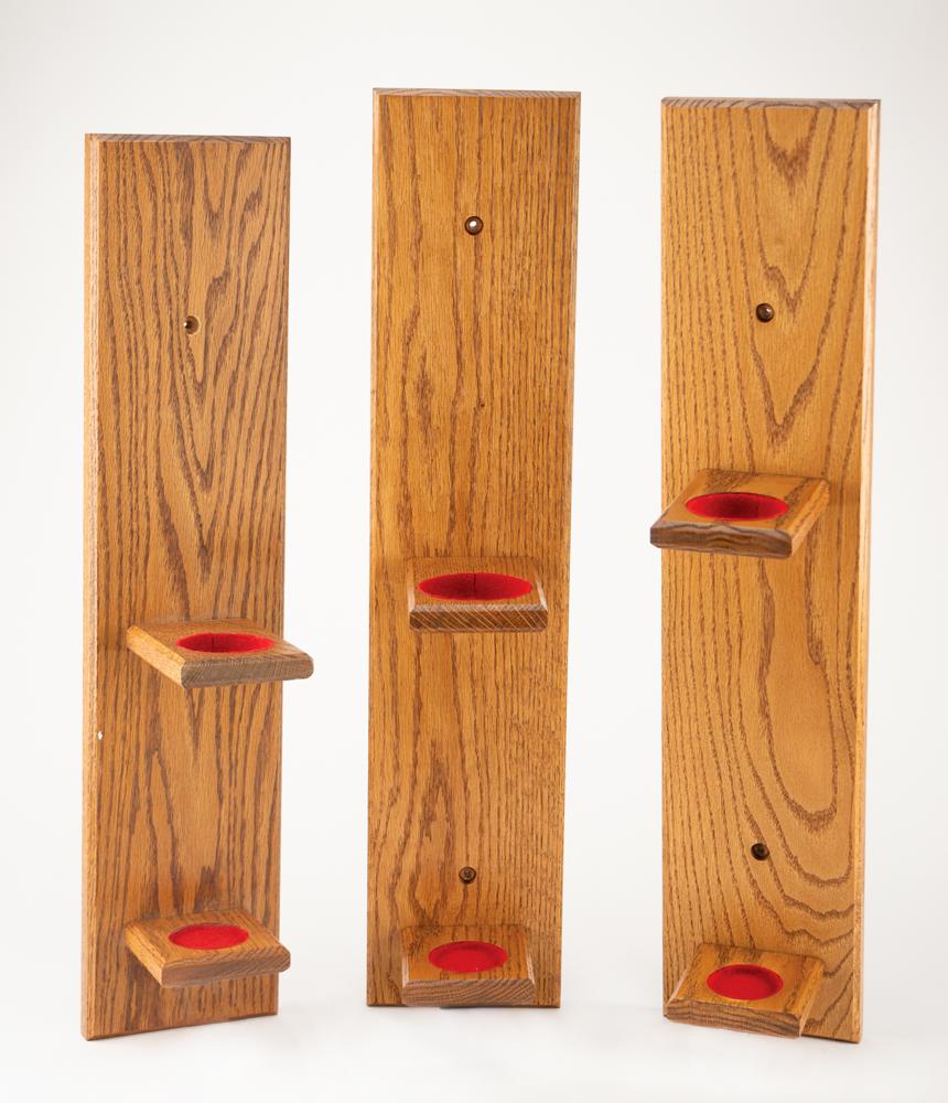 Trio of mountable wooden display holders for three of the torches used in the Mexico City 1968 Summer Olympics torch, 5.5″ x 24.25″ x 6″, 5.5 x 25.5 x 6.25, and 5.5″ x 25.5″ x 6″, with upper body holders and lower handle pads lined in red felt. Custom made by Forever Yours. Label on reverse of the smallest holder indicates the torch as the 'cast metal style'; the other holders do not specify torch style. In overall fine condition. Includes mounting screws and wooden button plugs.