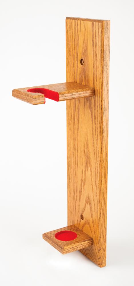 Mountable wooden display holder for the Melbourne 1956 Summer Olympics torch, 5.5″ x 21.5″ x 6.75″, with upper handle holder and lower base pad lined in red felt. Custom made by Forever Yours. In fine condition. Includes mounting screws and wooden button plugs.