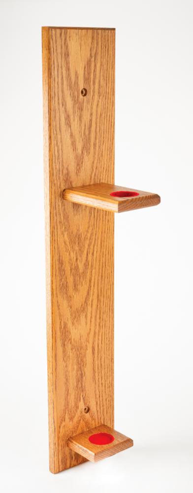 Mountable wooden display holder for a Montreal 1976 Summer Olympics torch, 5.5″ x 30″ x 6.5″, with upper handle holder and lower base pad lined in red felt. Custom made by Forever Yours. In fine condition. Includes mounting screws and wooden button plugs.