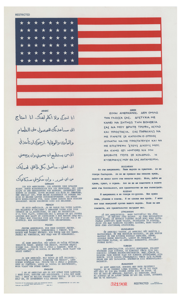 Cold War-dated original fabric United States Air Force blood chit, 9.5 x 15.5, issued as No. 32190R for the USSR and its satellite countries, marked “Restricted” in the upper and lower borders, with large American flag to top and the balance of notice featuring a help message in 14 different languages: Arabic, German, French, Polish, Czech, Slovak, English, Greek, Bulgarian, Russian, Lithuanian, Hungarian, Turkish, and Romanian. The English caption: “I am an American and do not speak your language. I need food, shelter and assistance. I will not harm you; I bear no malice toward your people. If you help me, my government will reward you.” Lithographed by S. F. Apr. 1951, and published by the Aeronautical Chart and Information Service. In fine condition. Also known as an escape and identification flag, a blood chit is a notice that is carried by the military, usually aircraft personnel, that displays messages aimed at civilians, which asks them to help the service member in the event they are shot down.