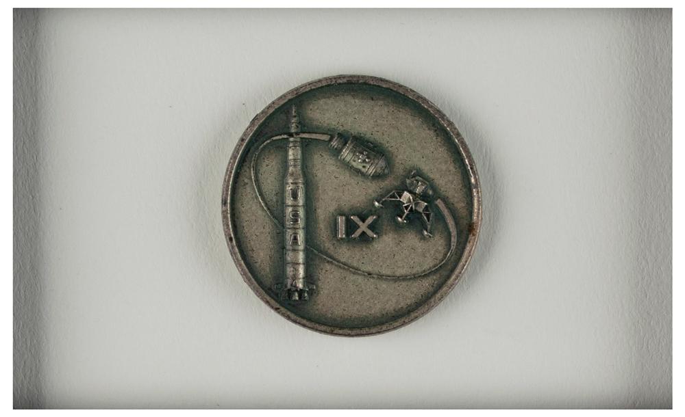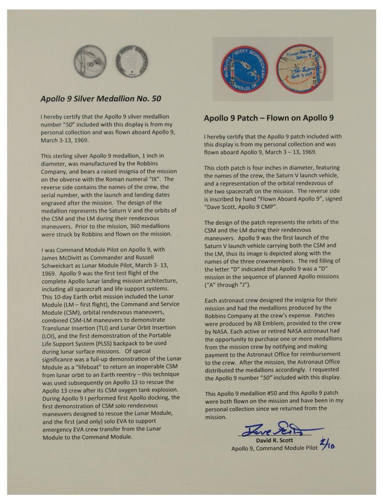 Limited edition display featuring a flown sterling silver Apollo 9 Robbins medallion (No. 50), and a flown embroidered Apollo 9 mission patch, both of which were carried into Earth's orbit during the Apollo 9 mission and derived from the personal collection of astronaut Dave Scott. Both items are mounted and matted with plaques certifying their flown status, and a color photo of Scott performing a stand-up EVA on March 6, 1969, signed in silver ink, "Dave Scott, Apollo 9 CMP"; the entire display, numbered 2/10, is archivally framed to an overall size of 14 x 17. In overall fine condition.