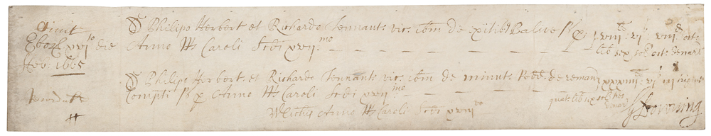 Sir George Downing, 1st Baronet was a British politician (1623-1684) for whom Downing Street, the site of the Prime Minister’s residence, is named. Vellum manuscript DS, signed “G. Downing,” one page, 13.5 x 2.5, 1665. A receipt signed in the lower right corner by Downing. In fine condition.