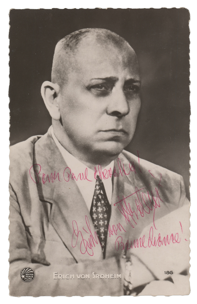 Vintage glossy 3.5 x 5.5 deckle-edge postcard photo of Erich von Stroheim, signed and inscribed in red ballpoint. Reverse of postcard bears a "Roger Hurlburt Collection" stamp. In fine condition, with some light postal impressions.