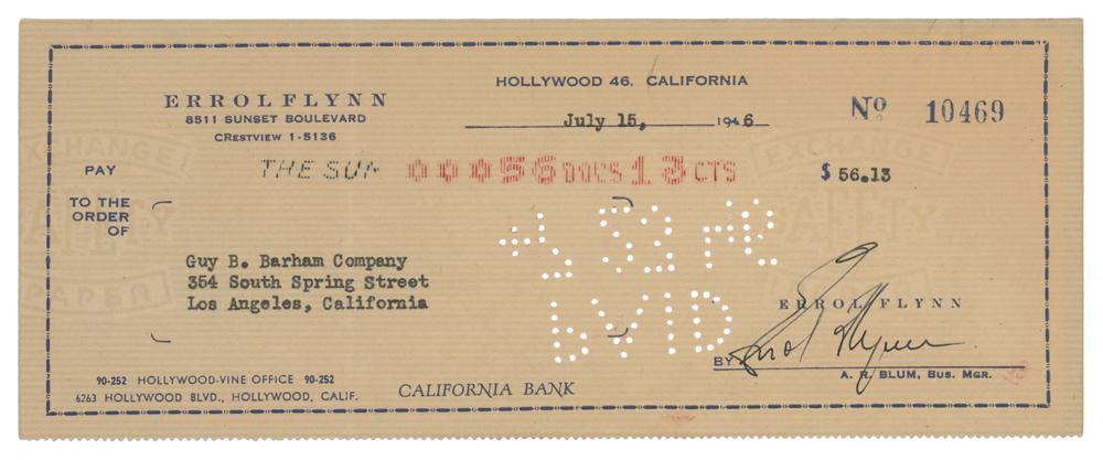 Personal check, 8.5 x 3.25, filled out in type and signed by Flynn, "Errol Flynn," payable to Guy B. Barnham Company for $56.13, July 15, 1946. In fine condition. Accompanied by an unsigned glossy photo of the actor.