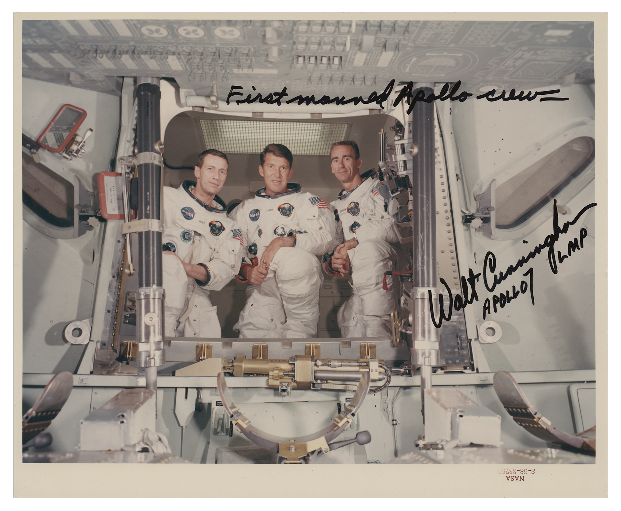 Original color glossy 10 x 8 red-numbered NASA photo of the Apollo 7 crew in 1968, signed in black felt tip, "First manned Apollo crew—Walt Cunningham, Apollo 7 LMP." Reverse bears purple NASA caption text and “A Kodak Paper” watermarks. In very fine condition.