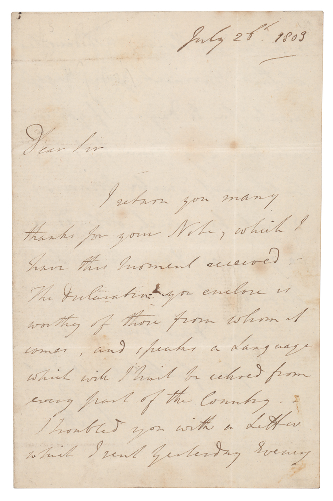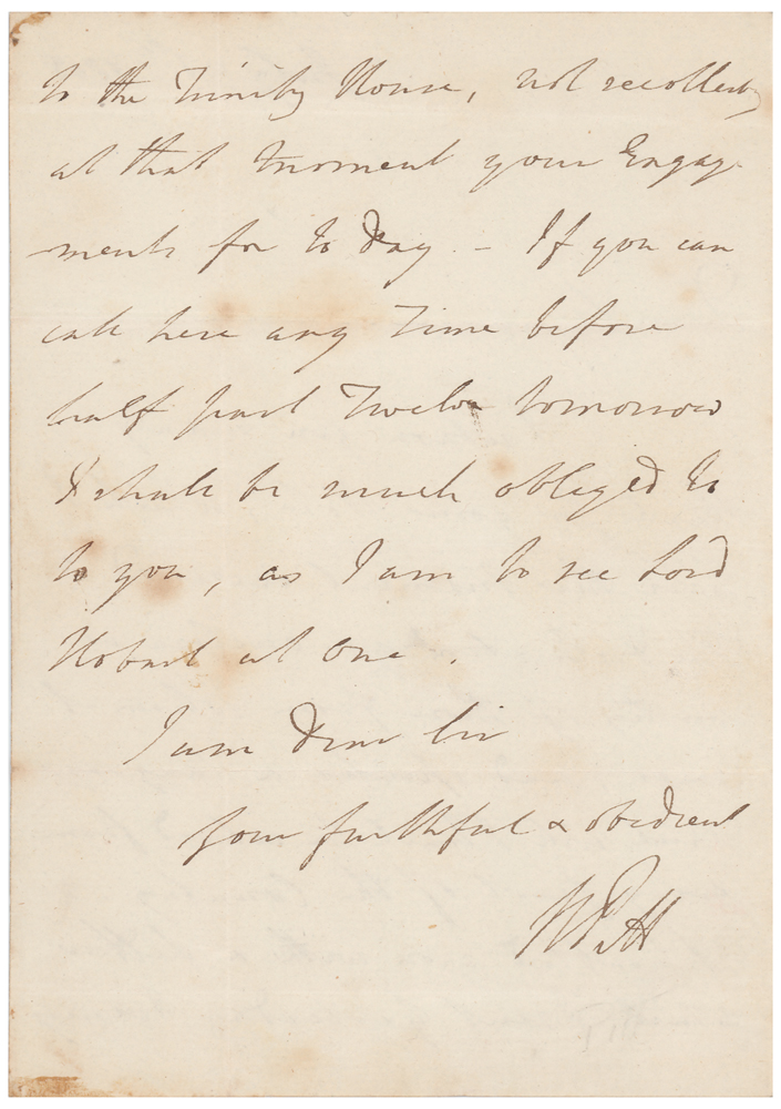 ALS signed “W. Pitt,” one page both sides, 4.5 x 7, July 26, 1803. Handwritten letter to an unidentified gentleman, in full: "I return you many thanks for your Note, which I have this moment received. The declaration you enclose is worthy of those from whom it comes, and speaks a Language which will I trust be echoed from every part of the Country. I troubled you with a Letter which I sent yesterday evening to the Trinity House, not recollecting at that moment your engagements for today. If you can call here any time before half past twelve tomorrow I shall be much obliged to you, as I am to see Lord Hobart at one." In fine condition, with light soiling and scattered light foxing.