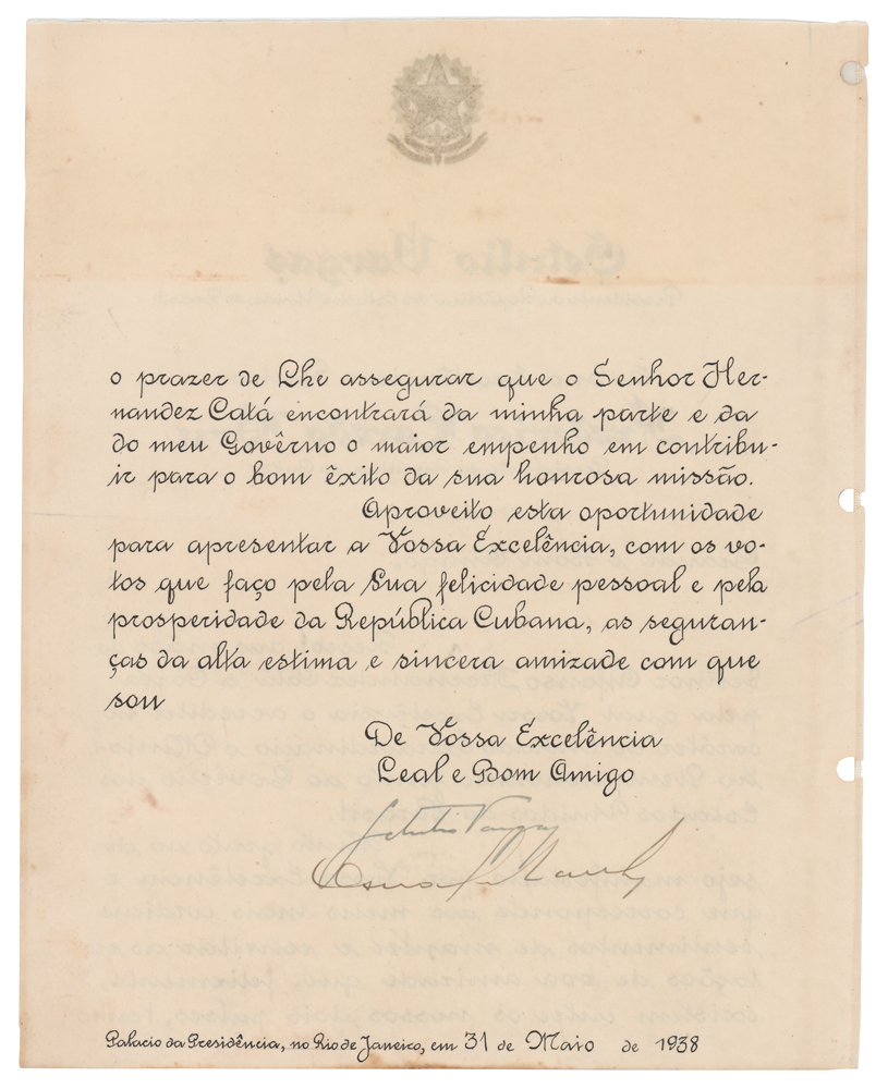 Brazilian lawyer and politician (born 1882) who served as Brazil’s president during two periods: from 1930 to 1945, and from 1951 until his suicide in 1954. Vargas led Brazil for 18 years, the longest of any president. Manuscript DS in Portuguese, one page both sides, 8.5 x 10.75, May 31, 1938. Official letter to Cuban President Federico Laredo Brú, in part (loosely translated): “I received from the hands of Mr. Alfonso Hernandez the letter by which Your Excellency accredited it in the character of Envoy Extraordinary and Minister Plenipotentiary with the government of the United States of Brazil. Very grateful to the desire expressed by Your Excellency and which corresponds to my most cordial feelings of maintaining and strengthening the relationships of good friendship that, happily, exist between our countries, I am pleased to assure you that Mr. Hernandez Cata will find on my part and that of my Government's greatest commitment to contributing to the success of its honorable mission. I take this opportunity to present Your Excellency, with the wishes that I make for Your personal happiness and for the prosperity of the Cuban Republic.” Signed at the conclusion by Getúlio Vargas as President of Brazil. In very good to fine condition, with trimmed edges, three file holes, and some staining and paperclip impressions to the first page.