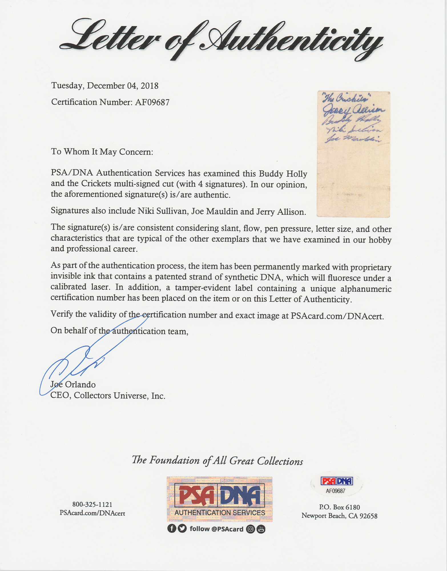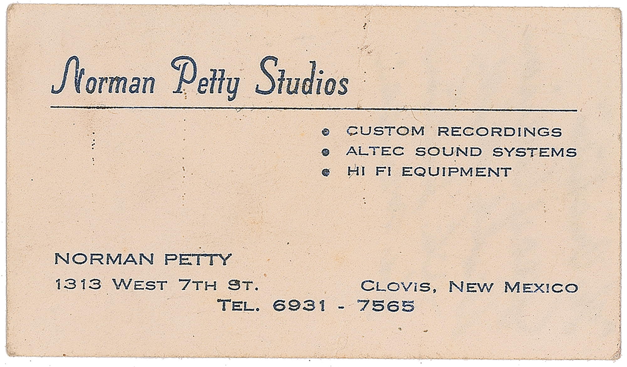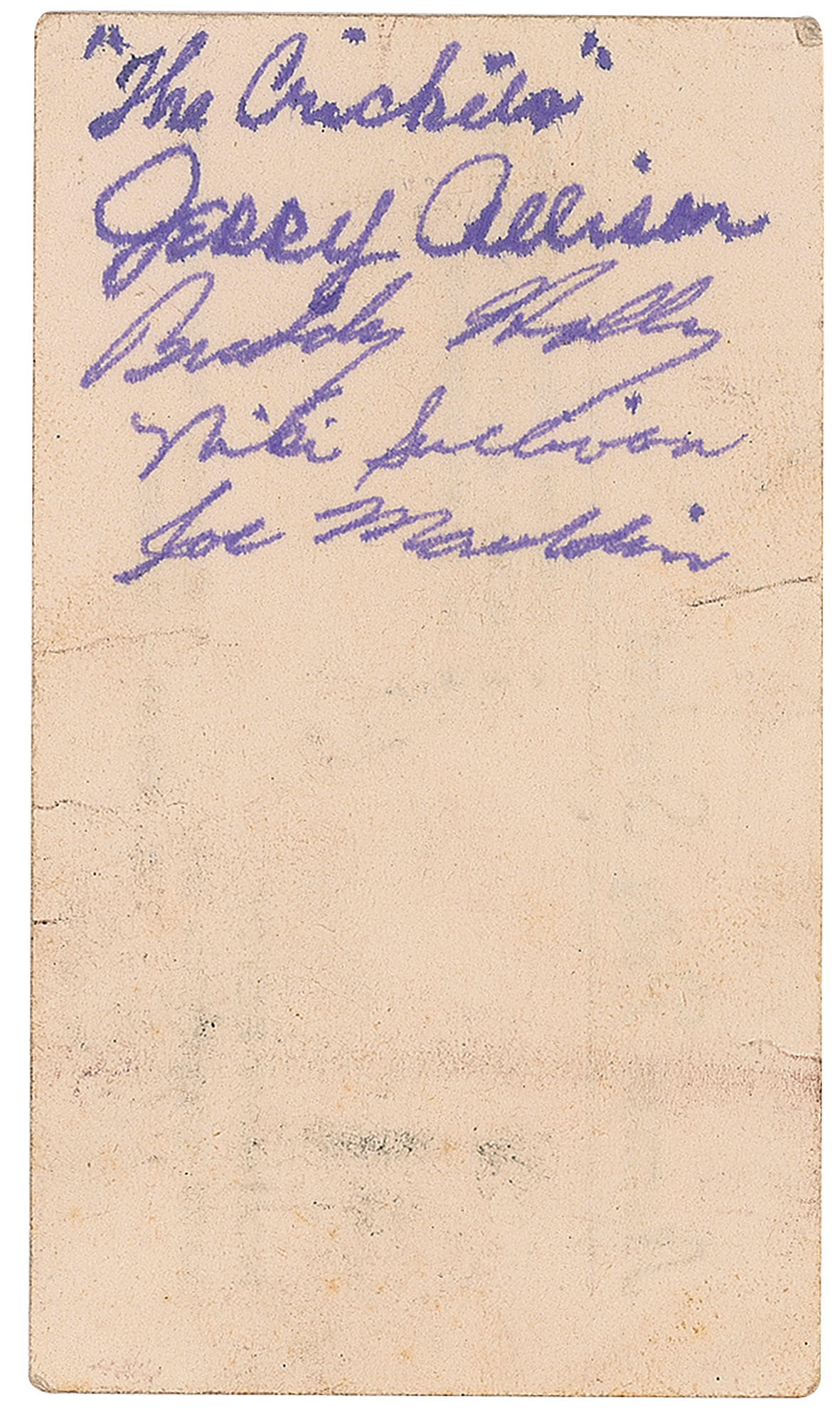 Extremely rare purple ink signatures of Buddy Holly, Niki Sullivan, Joe Mauldin, and Jerry Allison, who adds "'The Crickets,'" on the reverse of a 3.5 x 2 business card from Norman Petty Studios in Clovis, New Mexico. In fine condition, with light soiling and a few small edge creases. Accompanied by a full letter of authenticity from PSA/DNA. Autographs of Buddy Holly and the Crickets are rare and highly sought after.