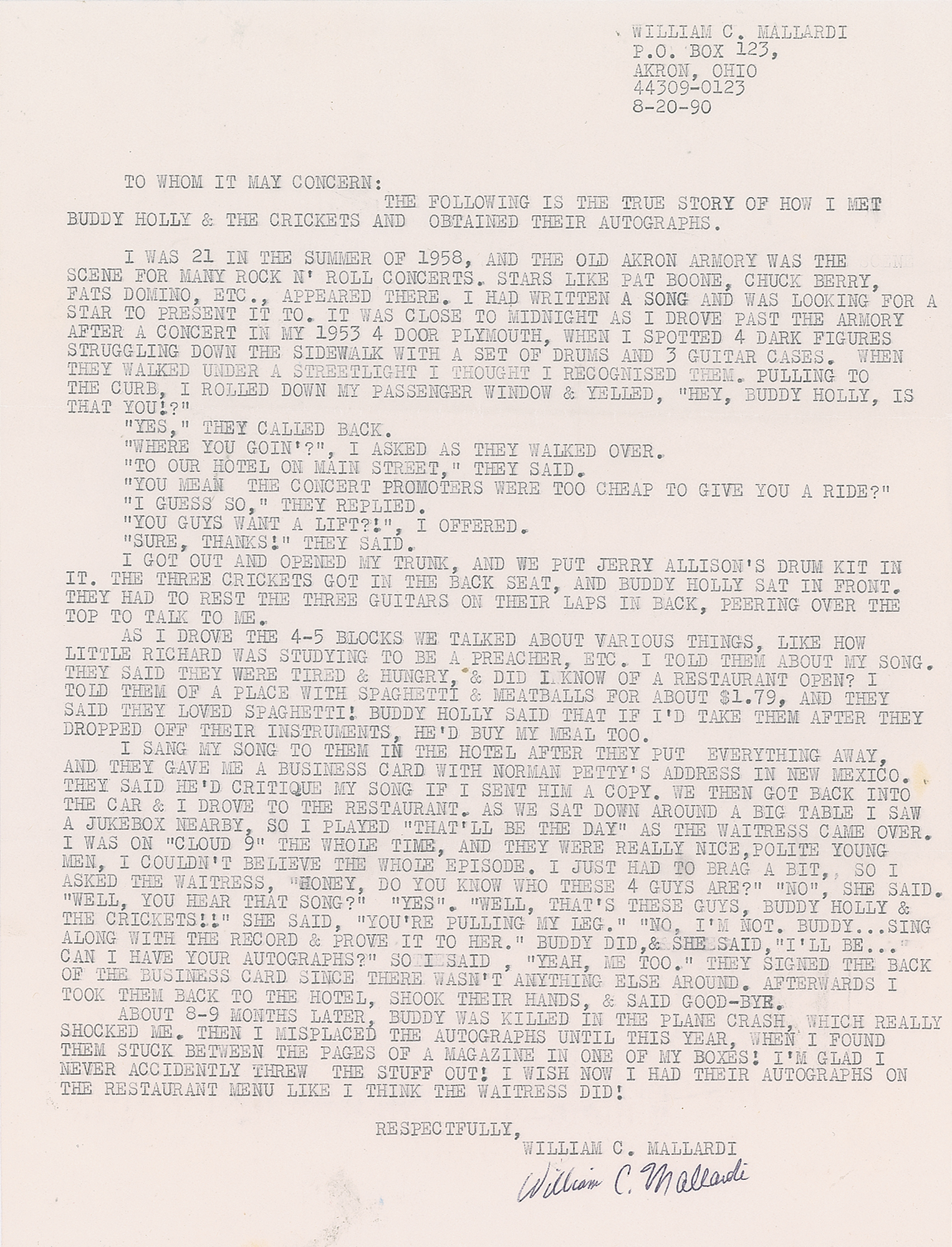 I sang my song to them in the hotel after they put everything away, and they gave me a business card with Norman Petty's address in New Mexico. They said he'd critique my song if I sent him a copy. We then got back into the car & I drove to [a] restaurant. As we sat down around a big table I saw a jukebox nearby, so I played 'That'll be the Day' as the waitress came over. I was on 'Cloud 9' the whole time, and they were really nice, polite young men, I couldn't believe the whole episode. I just had to brag a bit, so I asked the waitress, 'Honey, do you know who these 4 guys are?' 'No,' she said. 'Well, you hear that song?' 'Yes.' 'Well, that's these guys, Buddy Holly & the Crickets!!' She said, 'You're pulling my leg.' No, I'm not. Buddy?sing along with the record & prove it to her.' Buddy did, & she said, 'I'll be...can I have your autographs?' So I said, 'Yeah, me too.' They signed the back of the business card since there wasn't anything else around. Afterwards I took them back to the hotel, shook their hands, & said good-bye. About 8-9 months later, Buddy was killed in the plane crash."