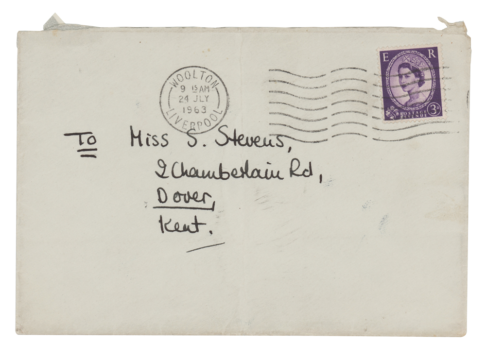 Accompanied by the original mailing envelope, postmarked at Woolton, Liverpool, July 24, 1963, a certificate of authenticity from Tracks, and by a letter of provenance from the original recipient, which reads: “In July 1963 The Beatles were performing at The Winter Gardens, Margate for six consecutive nights (8th - 13th July). I was 15 years old and a group of us who all attended Dover Girl’s Grammar School decided to go to see them. I think we went to the earlier of the two daily performances but I don’t remember the date. We had front row seats and it was a great experience?As it is almost 55 years ago I don’t remember exactly what happened, but I believe the organizers had no more promotional photos/pictures to give out at the time and we were told that if we brought an SAE over to The Winter Gardens before the Beatles had completed their shows we would be sent pictures/autographs requested. So one of our group took our SAEs over to Margate and subsequently I received mine posted from Liverpool with the promotional picture signed by George Harrison (my favourite Beatle!)."