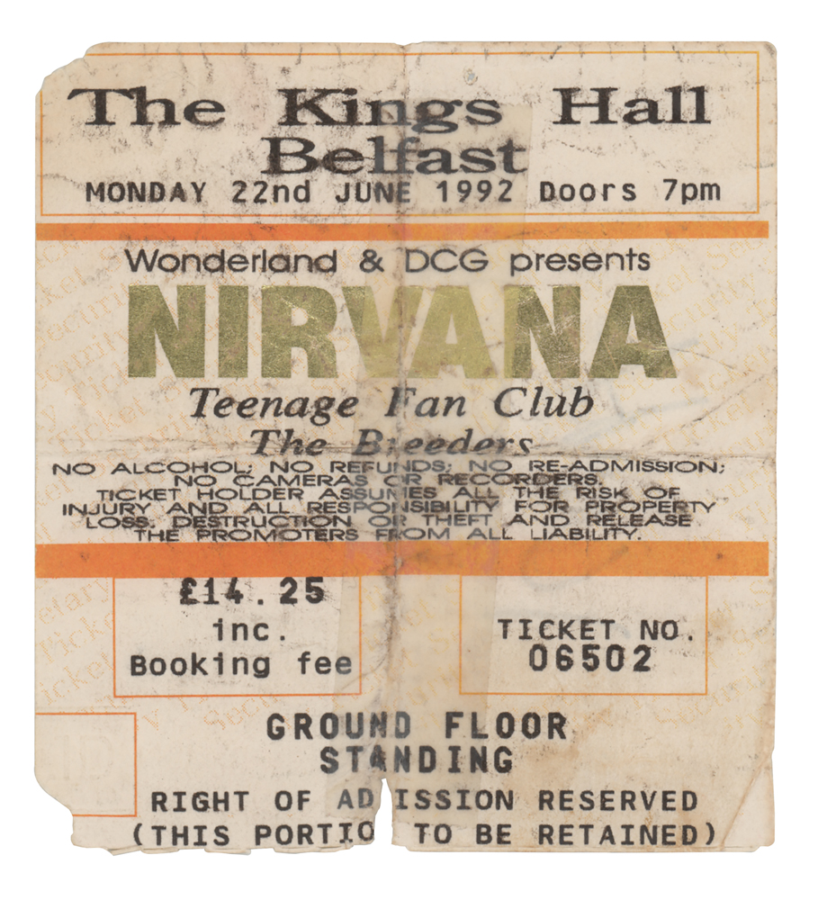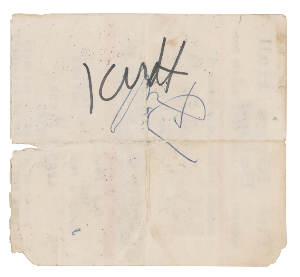 Original 4 x 3.5 ticket stub for a Nirvana concert held at The Kings Hall in Belfast, Northern Ireland on June 22, 1992, which is signed on the reverse in black felt tip by Kurt Cobain, “Kurdt,” and in black ballpoint by Dave Grohl, “David.” In very good condition, with overall creasing, minor edge loss, and intersecting folds reinforced with clear tape on the ticket's face.