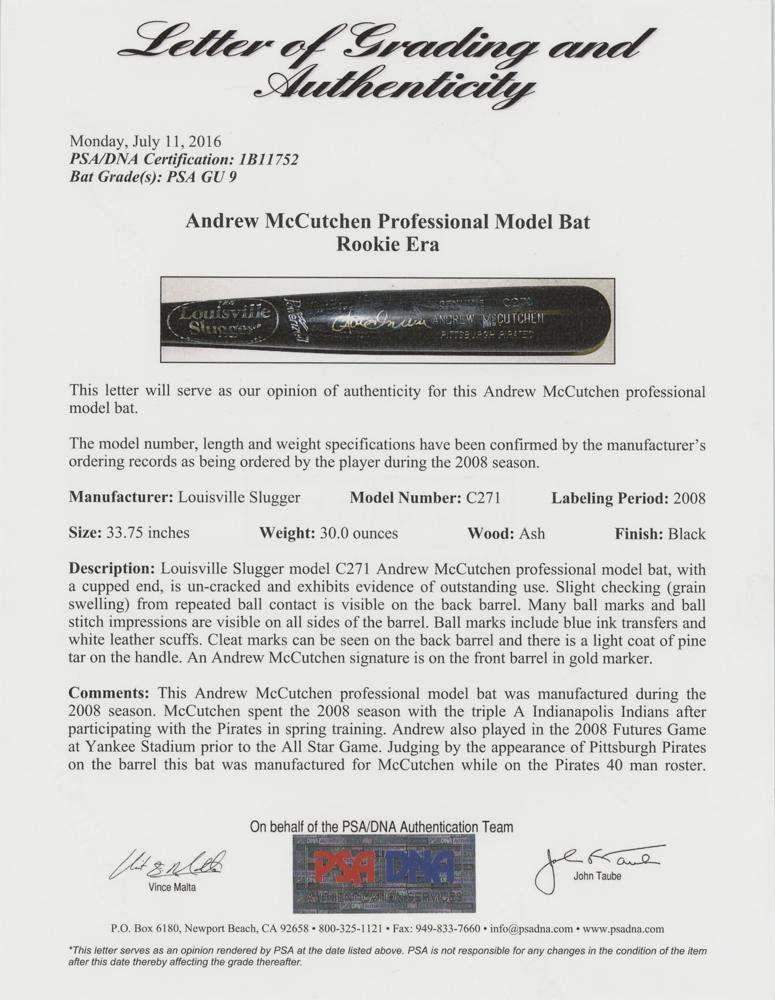 Andrew McCutchen's game-used rookie-era circa 2008 Louisville Slugger C271 personal model baseball bat, engraved on the barrel with his name and team ("Andrew McCutchen, Pittsburgh Pirates"), and signed in gold ink. The black ash bat measures 33.75″ long and weighs 30 ounces. It is uncracked and exhibits excellent signs of use, including slight checking from repeated ball contact, marks and ball stitch impressions on all sides of the barrel, and a light coat of pine tar on the handle. Accompanied by a letter of grading and authenticity from PSA/DNA, grading it as "PSA/DNA GU 9," noting that the bat was evidently manufactured for McCutchen while on the Pirates' 40-man roster in 2008. Although he spent the full season with the AAA Indianapolis Indians, he was with the Pirates for spring training and also played in the 2008 Futures Game at Yankee Stadium; it is possible that he used the bat during his 2009 Major League rookie campaign. McCutchen would prove to be Pittsburgh's best player of the decade, taking home National League MVP honors in 2013, making five All-Star teams, and earning four Silver Sluggers.