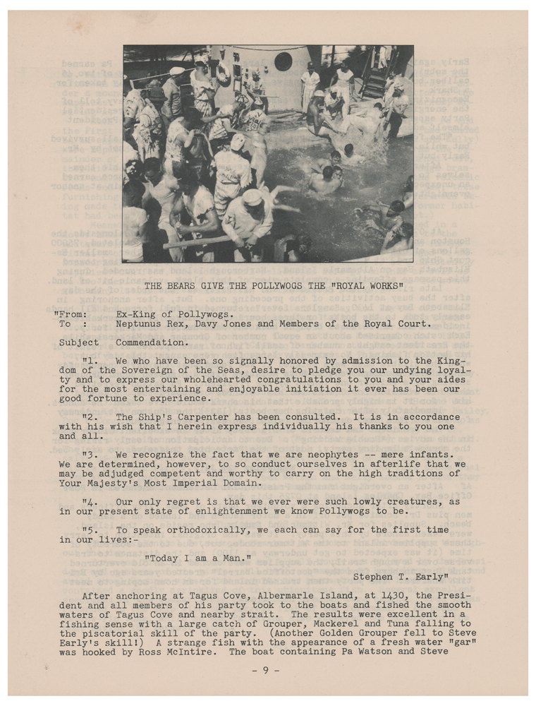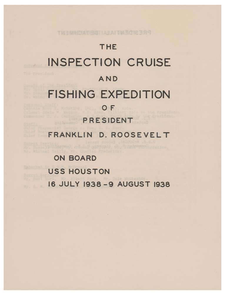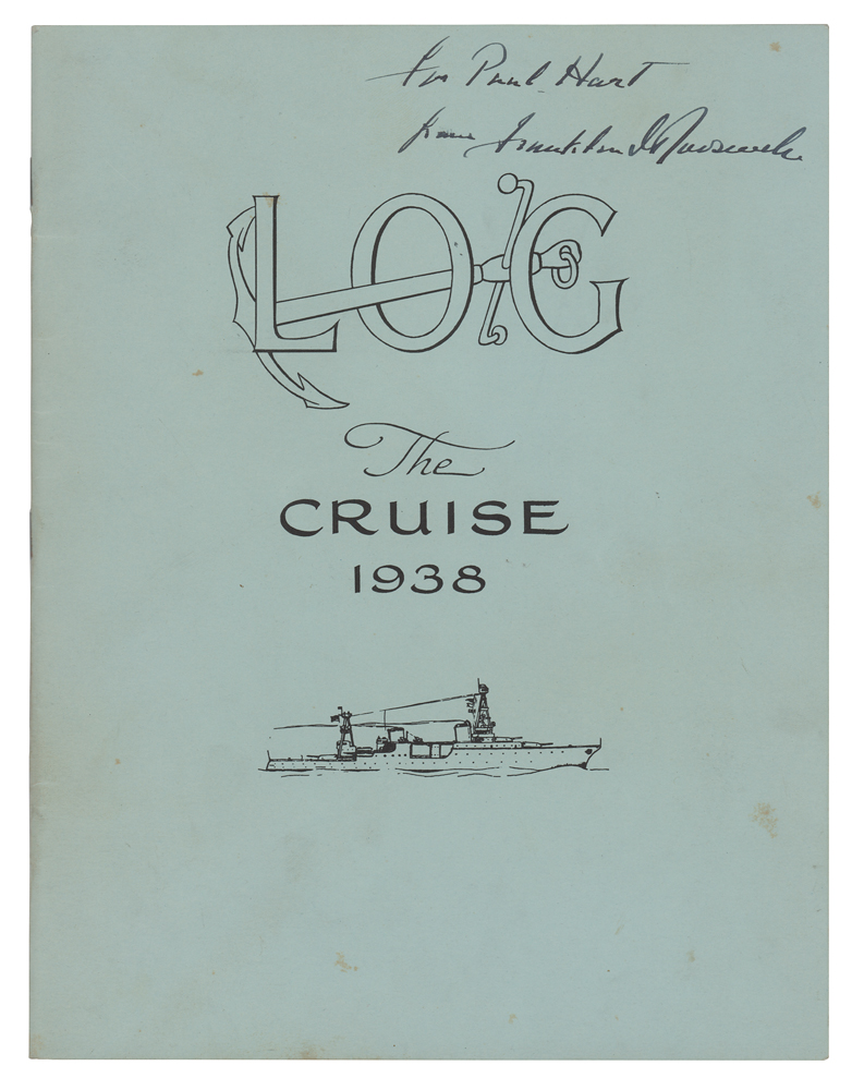 Scarce log booklet for “The Inspection Cruise and Fishing Expedition of President Franklin D. Roosevelt” aboard the USS Houston (CA-30) from July 16 to August 9, 1938, 31 pages, 7.75 x 10, signed and inscribed on the front cover in fountain pen to a White House secret service agent, “For Paul Hart, from Franklin D. Roosevelt.” This entirely uncommon booklet features sections listing the presidential party and detachment, the cruise’s itinerary with map, and the detailed daily log with accompanying images of Roosevelt, the crewmen, and the various fish caught during the voyage. The close of the booklet features a comprehensive nine-page appendix containing an “Annotated List of Fishes, Presidential Cruise, 1938,” compiled by Waldo L. Schmitt of the U.S. National Museum. Among Roosevelt’s more notable catches were a Tiger Shark, “the largest weighing between 225 and 230 pounds was caught by the President at Cocos Island, August [3rd],” [the booklet mistakenly attributes the catch to August 30th] and a Pacific Sailfish: “The President caught a sailfish on knot or tangle of his line—having two sailfish on the line at the same time. The hooked one got away, but the one in the knot was caught—and landed in twenty minutes.” In fine condition.