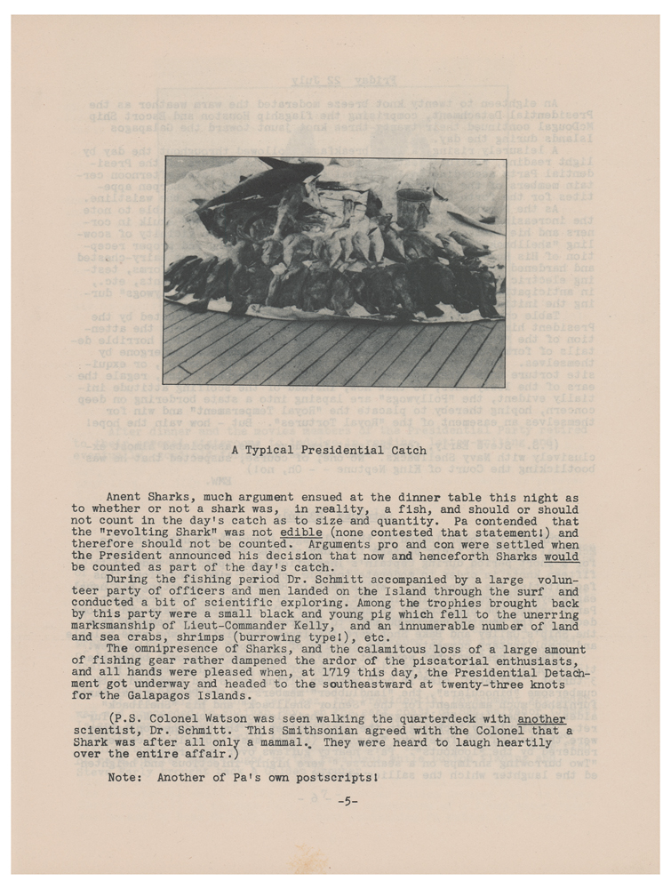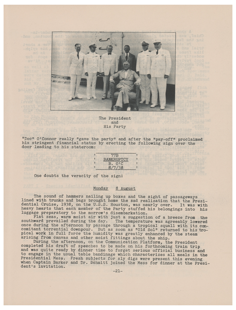 The Presidential Cruise was organized in conjunction with President Franklin D. Roosevelt, and took place during the summer of 1938. Traveling aboard the USS Houston from July 16th to August 9th, the cruise departed San Diego, California, in route to the Galapagos Islands, via the Panama Canal. Along the way, it stopped at Old Providence Island in the Caribbean Sea. The expedition was a fishing cruise taken by FDR to the waters off the coast of Central and South America, with Roosevelt inviting the Smithsonian to send scientific staff along to collect marine and botanical specimens. Dr. Waldo Schmitt of the U.S. National Museum was appointed naturalist of the cruise and was assisted by ship personnel including Russell Wood, James Stringfelow, Michael Reilly, Charles Fredericks, Ross T. McIntire, Stephen Early, Basil O’Connor, Frederick Adams, and Thomas Qualters. During the cruise, the team collected many specimens including plants, mollusks, fish, sponges, and other invertebrates. Several new species were discovered, including a new type of palm tree, Siriella roosevelti, named for the President.