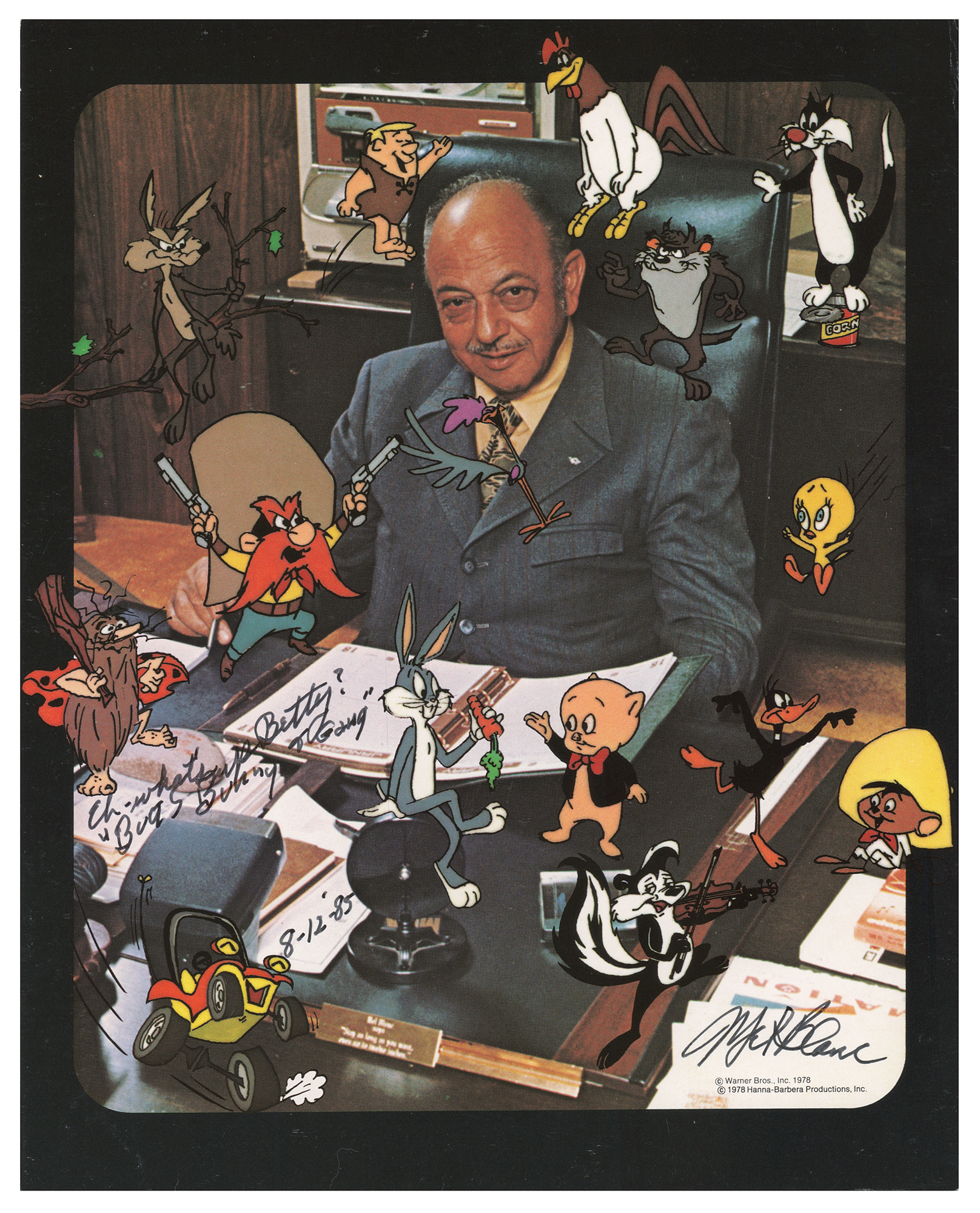 Color semi-glossy 8 x 10 cardstock photo of Blanc surrounded by the legendary characters he voiced, signed and inscribed in thin black felt tip, "Eh—what's up Betty? 'Bugs Bunny & Gang,' 8-12-85, Mel Blanc.” In fine condition.