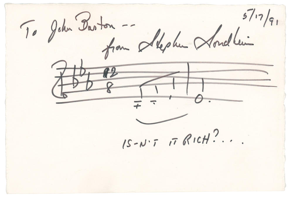 AMQS on a white 6.25 x 4.25 card, signed and inscribed in black felt tip, "To John Barton—from Stephen Sondheim, 5/17/91." Sondheim pens two bars from his song 'Send In the Clowns,' writing the lyrics below, "Isn't it rich?" In very fine condition.