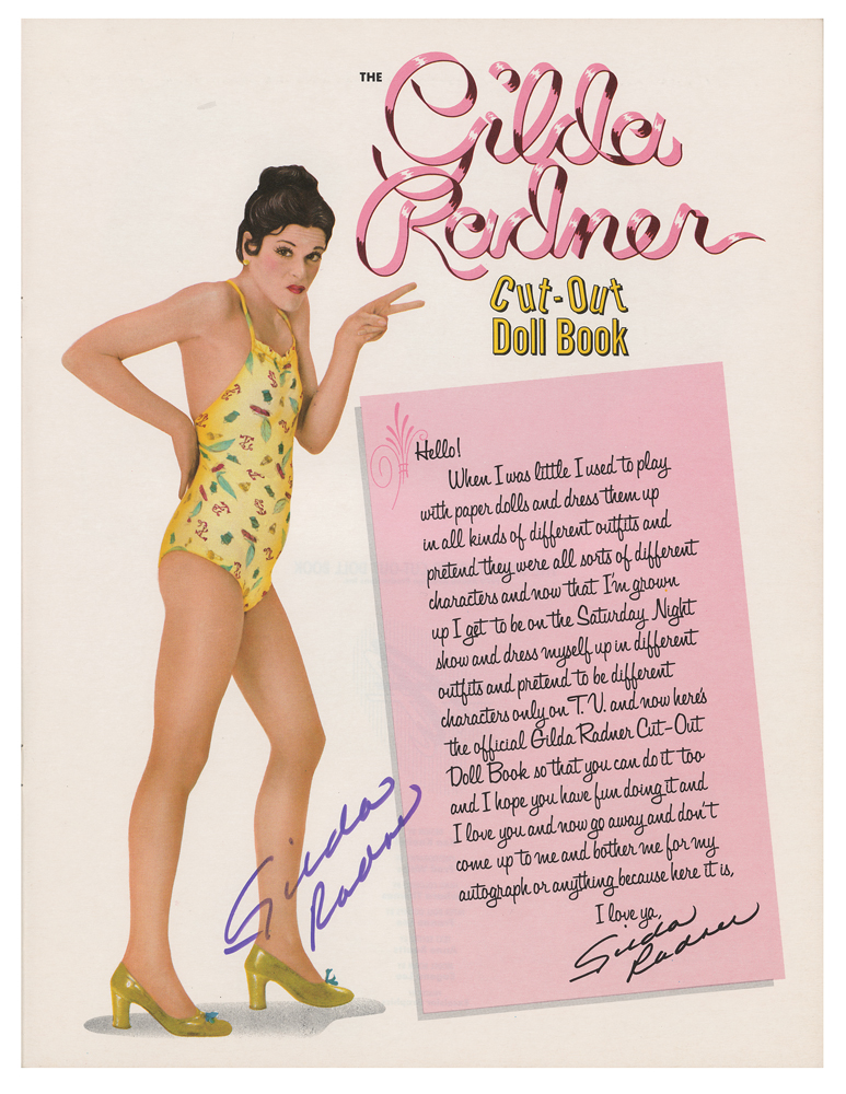 Gilda Radner Cut-Out Doll Book published in 1979 by Above Average Productions, 10 x 13, signed on the first page in purple felt tip by Radner. The front cover and first page also feature printed facsimile signatures. In fine condition. Accompanied by a full letter of authenticity from Beckett Authentication Services.