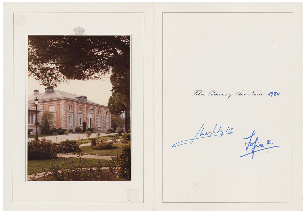 Card offering wishes for a "Happy Easter and New Year" in 1984, measuring 12.25 x 8.75 open, signed inside in blue felt tip by King Juan Carlos I and Queen Sophia of Spain. In fine condition, with an identification notation on the front of the card, and two small pieces of tape on the photo panel.