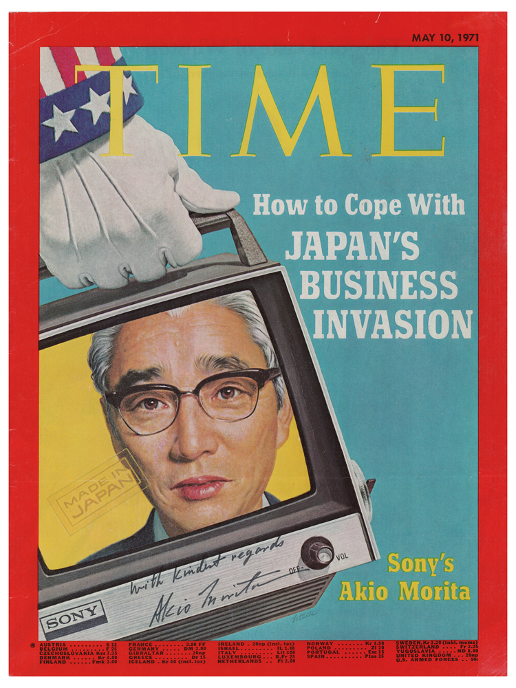 Japanese physicist and businessman (1921-1999) who co-founded the Sony Corporation. Cover of Time Magazine from May 10, 1970, with a story on Japan's business innovation highlighting Morita, 8.25 x 11, signed in black felt tip, "With kindest regards, Akio Morita." In very good to fine condition, with scattered light creasing, and a horizontal fold passing across the lower part of Morita's face.