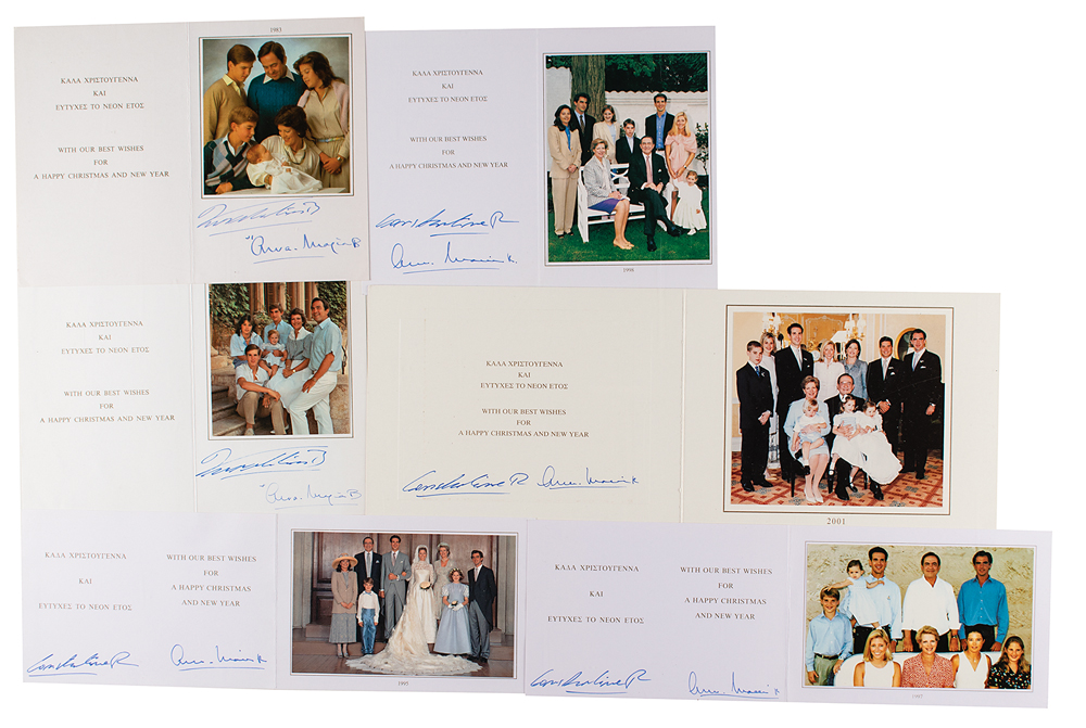 King of Greece (born 1940) from 1964 until the abolition of the monarchy in 1973; he was also a former competitive sailor and Olympian, winning a gold medal in the 1960 Rome Olympics in the Dragon class sailing event. Six Christmas cards from the Greek royal family dating from 1983 to 2001, measuring from 9 x 6.5 to 16 x 6.25 (open), all signed inside in blue ink by King Constantine II of Greece and Queen Anne-Marie of Greece. In fine condition.