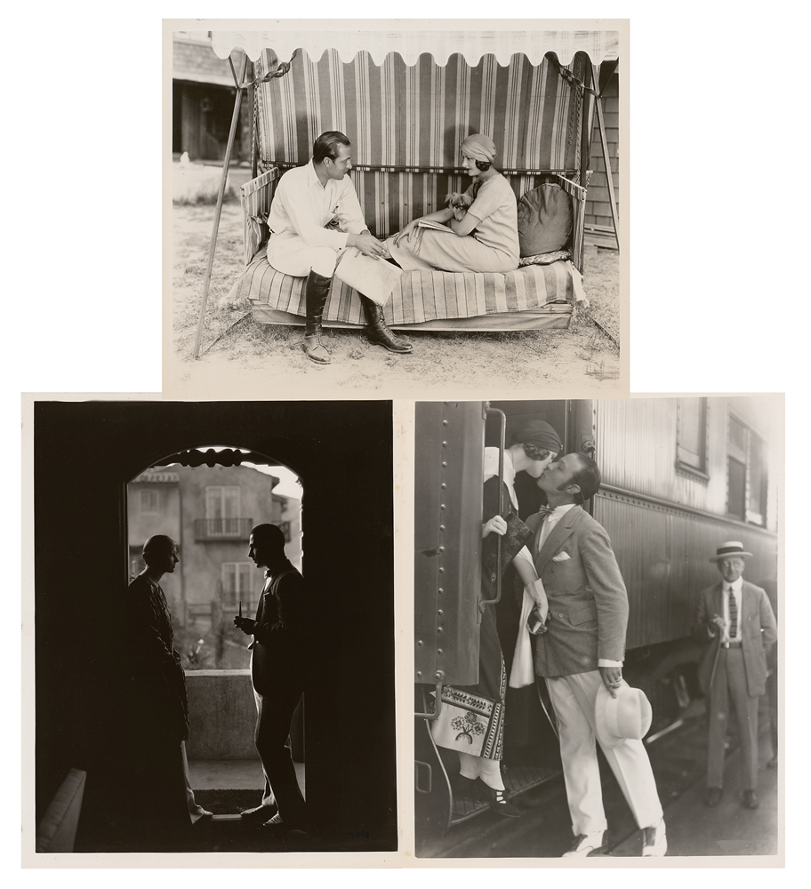 Collection of 133 vintage glossy photos celebrating the life of famed Italian silent film star Rudolph Valentino, each approximately 8 x 10 or 10 x 8, with 80 of the photos focusing on Valentino and his two-year marriage with Natacha Rambova, showing the pair in public, on film sets, and during leisure moments. The remaining 53 photos document the funeral of Valentino, who tragically died at the age of 31, and include images of the funeral service, the procession, his crypt at Hollywood Forever Cemetery, and the commemoration of his bronze ‘Aspiration’ monument designed by Roger Noble Burnham. In overall fine condition, with curling and the majority of photos bearing binder dings to one edge, which could either be trimmed or matted over.