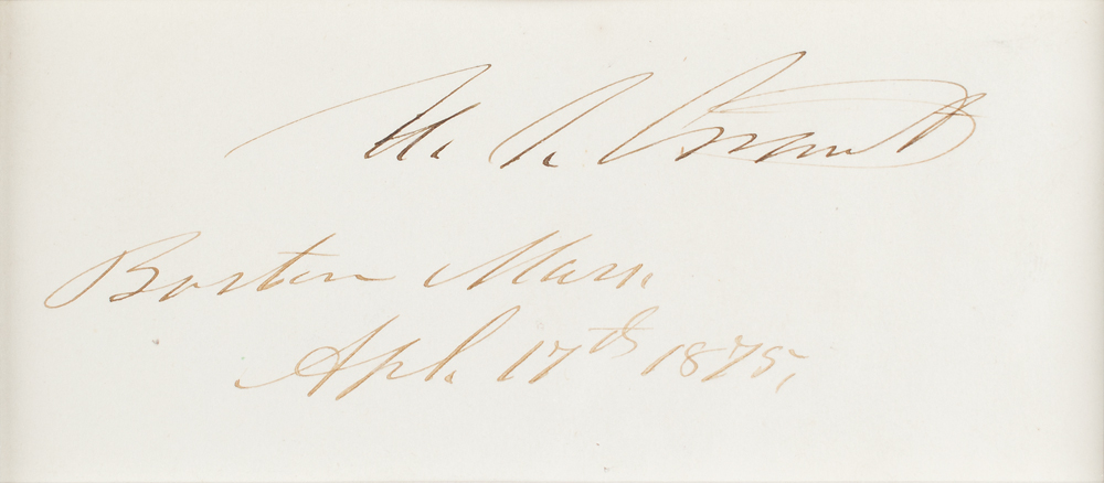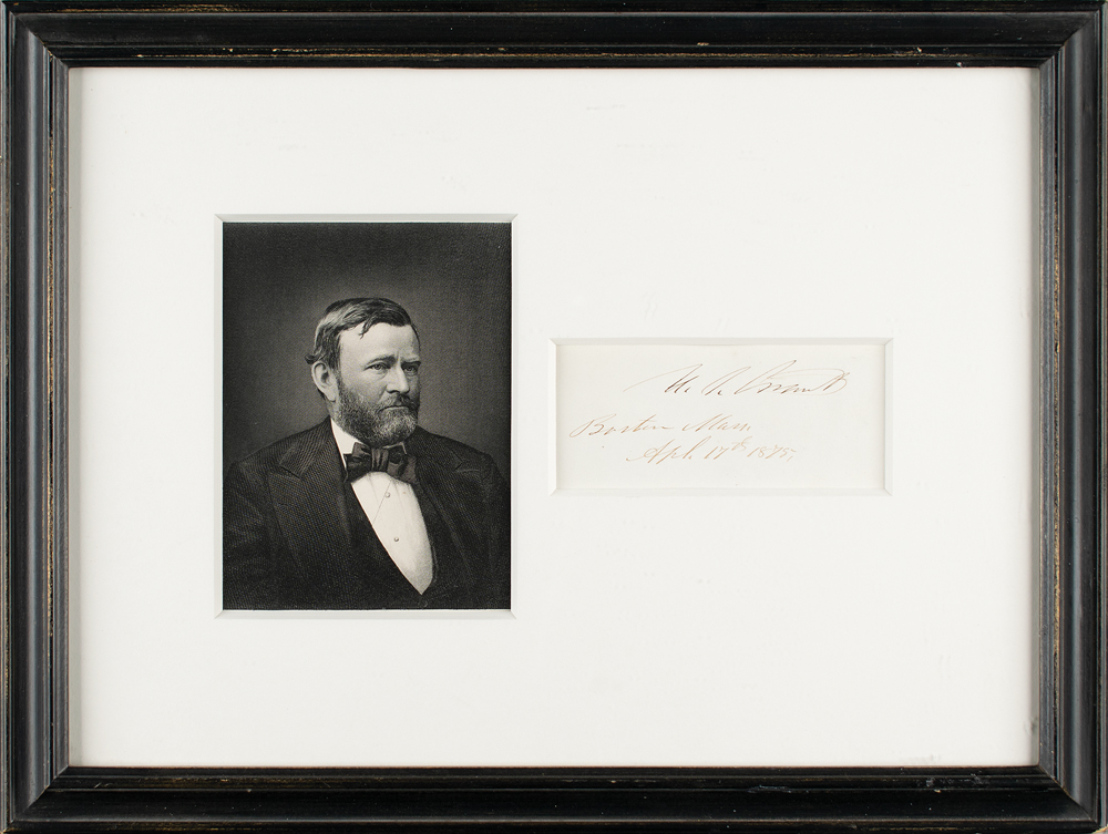 Highly desirable neat ink signature as president, "U. S. Grant, Boston, Mass., Apl. 17th 1875,” on an off-white 4.5 x 2 slip. Handsomely matted and framed with an engraved portrait to an overall size of 15 x 11.5. In fine condition.