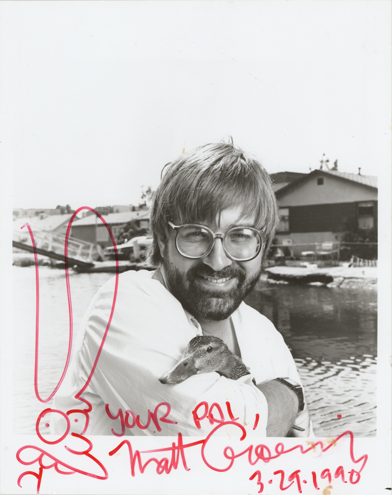 Early glossy 8 x 10 photo of the Simpsons creator holding a very content duck, signed in red felt tip, "Your pal, Matt Groening, 3-29-1990," who draws a large sketch of Binky the rabbit to the left side. In fine condition, with a few light stains near the last name and date. A delightfully early signed photo that dates to the first season of The Simpsons.