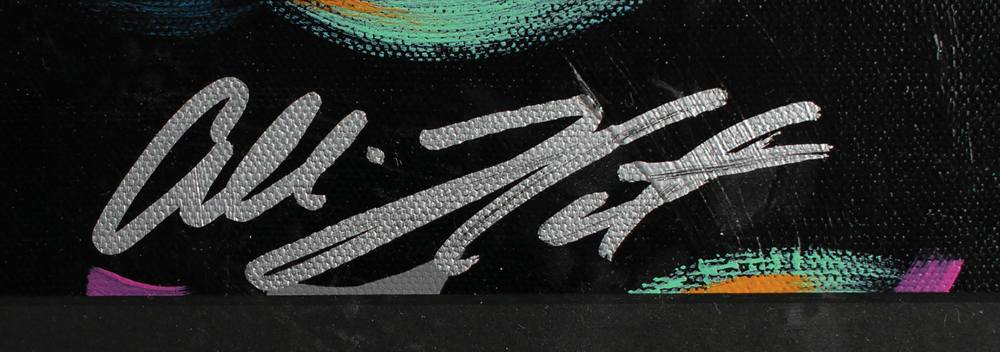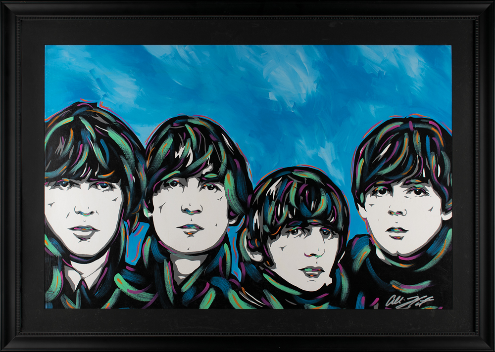 Huge original 'pop art' painting of the Beatles by acclaimed artist Allison Lefcort, accomplished in acrylic on 35.5 x 23 canvas, signed in the lower right in silver ink, “Allison Lefcort.” The brilliant artwork depicts George Harrison, John Lennon, Ringo Starr, and Paul McCartney in colorful hues against a blue-and-white background. Impressively matted and framed to an overall size of 43 x 30.5. In fine condition.