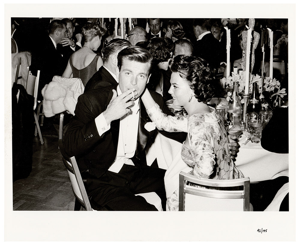 Limited edition 19.75 x 15.75 silver gelatin photograph of Natalie Wood and Robert Wagner together at a 1959 Oscar Dinner in Los Angeles. Blindstamped in the lower border by the estate of photographer Frank Worth, and numbered 42/195. In fine condition. Accompanied by a certificate of authenticity from the executor of the Frank Worth Estate.