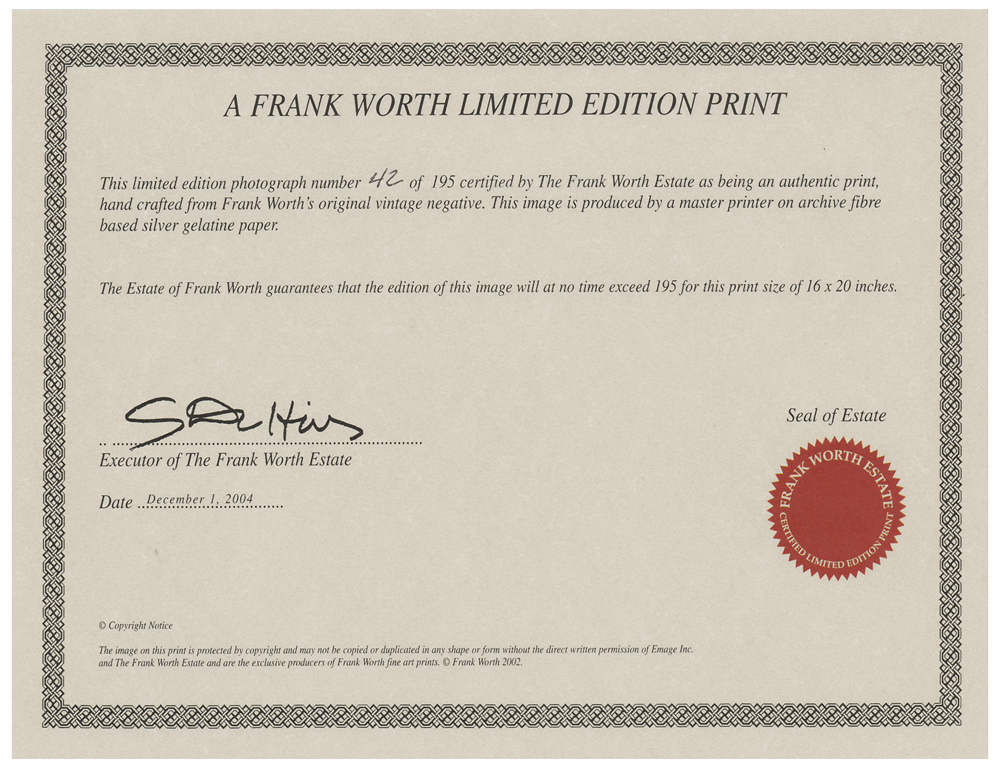Sent to Hollywood as a staff photographer for the International News Service in 1940, 17-year-old Frank Worth quickly developed a unique rapport with the A-list celebrities he encountered. Transitioning from photographer to friend with relative ease, he spent over five decades capturing some of the most remarkable candid photos of Hollywood's elite, who typically only allowed carefully posed glamour portraits and publicity shots. Despite his own financial struggles, Worth valued the privacy of his famous friends above his potential earnings, and never exhibited these images during his lifetime. After his passing in 2000, a company was formed to finally publish his thousands of unseen images. This is one of the captivating images released by the Frank Worth Estate.