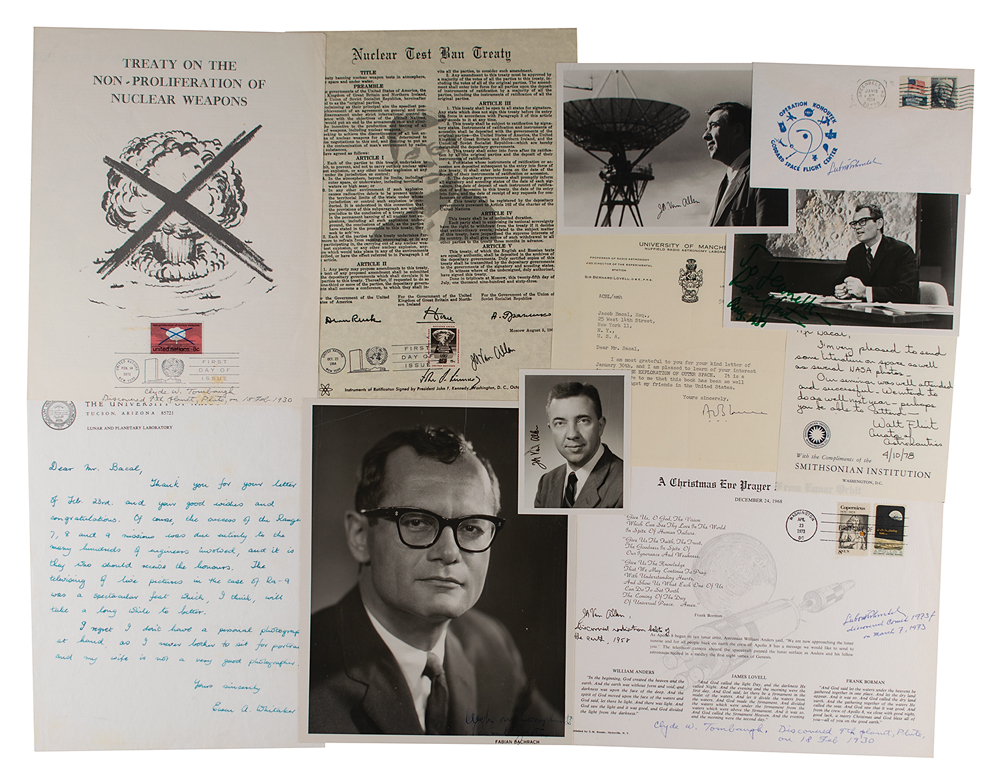 Eleven items signed by astronomers, including photographs, letters, and postal souvenirs, with one multi-signed piece. Signers are: Walt Flint, Robert Jastrow (2), Sir A. C. Bernard Lovell, Lubos Kohoutek (2), Clyde Tombaugh (2), James Van Allen (3), and Ewen Whitaker. In overall fine condition.